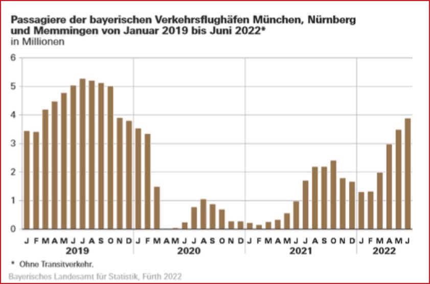 Bayerns größter Flughafen, München, zählte im ersten Halbjahr heuer bei 124 917 Starts und Landungen (plus 231,9 Prozent) rund 12,9 Millionen Passagiere und meldete damit nahezu eine Versechsfachung der Zahl der Fluggäste gegenüber dem Vorjahres-Halbjahr. Das Fracht- und Postaufkommen stieg ebenfalls deutlich um 89,3 Prozent auf gut 135 000 Tonnen.