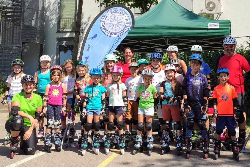 (ty) Im Rahmen des "Schweidino"-Ferien-Programms hat der Ski-Club von Schweitenkirchen ein Inline-Skating-Event für Kinder angeboten. Insgesamt 16 Buben und Mädchen wurden von sieben Betreuern in Empfang genommen (Foto oben). In verschiedenen Gruppen konnten die Kinder dann spielerisch das Inline-Skaten lernen und üben beziehungsweise ihre Kenntnisse verbessern. Dabei ging es unter anderem um Bremsen und Kurven-Fahren, aber auch um das richtige Fallen. Bei den Übungen kamen auch Kipp-Stangen zum Einsatz. Für die Kinder gab es obendrein noch Getränke und Gummibärchen sowie ein Eis.