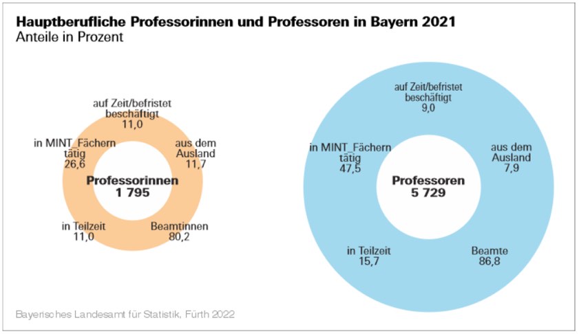 Die Professorinnen waren vorwiegend in den Fächergruppen "Rechts-, Wirtschafts- und Sozialwissenschaften" (33,6 Prozent) sowie "Geisteswissenschaften" (15,7 Prozent) tätig, bei den Professoren dominieren die Fächergruppen "Ingenieurwissenschaften" (34,8 Prozent) sowie "Rechts-, Wirtschafts- und Sozialwissenschaften" (24,2 Prozent). Gut jede vierte Professorin (26,6 Prozent) hatte zum genannten Zeitpunkt einen Lehrstuhl in den so genannten Mint-Fächern ("Mathematik, Informatik, Naturwissenschaft und Technik") inne. Hochschul-Leitungs-Funktionen wurden von 215 Beschäftigten bekleidet, wovon 33 Männer und zehn Frauen eine Präsidial-Position innehatten. Zudem fungierten 26 Beschäftigte als Kanzler und 17 als Kanzlerin.