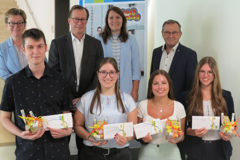 (ty) Grund zum Feiern hat es für vier Azubis am Pfaffenhofener Landratsamt gegeben. Sie schlossen mit durchwegs guten Prüfungs-Ergebnissen ihre Ausbildung zur Verwaltungs-Fachangestellten beziehungsweise zum Fachinformatiker für System-Integration ab. Für sie endet damit eine dreijährige Ausbildungszeit, in der sie sowohl in der praktischen Ausbildung in der Behörde als auch bei der bayerischen Verwaltungsschule und an der Berufsschule auf ihren Beruf vorbereitet worden waren. Vize-Landrat Karl Huber (Bürgerliste) gratulierte den drei jungen Frauen – Kathrin Amann, Nina Meyer und Verena Schmeller – sowie dem frisch gebackenen Fachinformatiker Christoph Pilsner und überreichte ihnen die Abschluss-Zeugnisse.