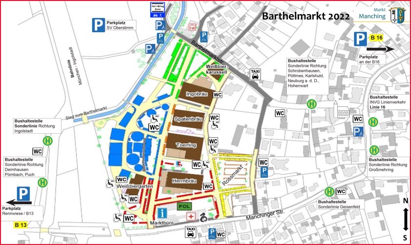 Die Zufahrten werden laut Gemeinde-Verwaltung mit absperrbaren Pfosten gesichert. Zusätzlich eingesetztes Security-Personal soll für reibungslose An- und Abfahrten der Standbetreiber und Lieferanten sorgen. Die zum Barthelmarkt 2019 eingeführte "Markt Manching Info"-App werde neben aktuellen Meldungen zum Fest auch etwaige Notfall- beziehungsweise Sturmwarnungen verbreiten. "Die Besucherinnen und Besucher haben auch vor Ort die Möglichkeit, sich die App aus dem jeweiligen Store kostenlos herunterzuladen und auf dem Smartphone zu installieren", heißt es weiter.