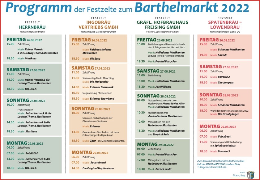 Am Freitagnachmittag beginnt das große Fest um 14 Uhr mit dem Standkonzert samt Festbier-Probe am Kirchenvorplatz. Anschließend marschieren die Vereins-Abordnungen ins Toerring-Festzelt zum offiziellen Bieranstich. Herzstück des Barthelmarkts sind nach Angaben aus dem Rathaus die vier Bierzelte sowie der Weißbiergarten, die von den Brauereien bestimmten Festwirten betrieben werden. Neu dabei seien die Zelte-Rachinger-GmbH mit Festwirt Roland Rachinger, die das Toerring-Zelt bewirtschafte, und die Schneider-Events-UG mit Festwirt Daniel Schneider im Spaten-Zelt. Der neue Spaten-Festwirt werde auch die Wahl der Barthelmarkt-Königin abhalten. Als neue Brauerei gibt sich Müllerbräu aus Pfaffenhofen die Ehre. Ebenfalls neu ist das Weißbier-Karussell der Silberfuchs-GmbH um Wirtin Julia Spitzenberger aus der Kreisstadt.