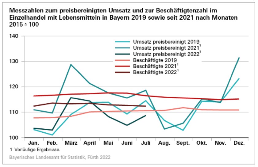 Im Vergleich zum Juni dieses Jahres wuchs der Umsatz im Einzelhandel im Freistaat im Juli in aktuellen Preisen um 5,1 Prozent, während die Zahl der Beschäftigten leicht rückläufig war. In den ersten sieben Monaten des laufenden Jahres nahm der Umsatz im bayerischen Einzelhandel verglichen mit den Vorjahres-Zeitraum nominal um 4,8 Prozent zu. Nach Preisbereinigung ergibt sich allerdings ein Minus in Höhe von 1,5 Prozent. Die Beschäftigtenzahl wuchs um 0,6 Prozent.