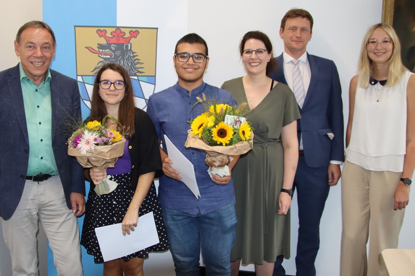 (ty) Pia Gottwald und Hasan Özen haben ihre dreijährige Ausbildung erfolgreich beendet und starten nun als ausgebildete Verwaltungs-Fachangestellte bei der Stadtverwaltung von Schrobenhausen in ihr Berufsleben. Nebst einem Blumenstrauß und Geschenk-Gutscheinen überreichte Bürgermeister Harald Reisner den beiden ihre Zeugnisse (Foto oben). Hasan Özen erhielt für seine Leistungen sogar den Staatspreis des Freistaats Bayern. Fast zwei Monate hatten die beiden auf ihre Ergebnisse gewartet. Gemeinsam mit den Ausbilderinnen Juliane Schubert und Eva Brandstetter sowie Geschäftsleiter Christian Finster übermittelte der Rathauschef den 19-Jährigen schließlich ihre Prüfungs-Ergebnisse und lobte: "Ihr könnt wirklich stolz auf Euch sein."