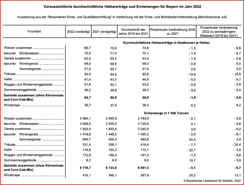 Die vorgestellten Ergebnisse des bayerischen Landesamts für Statistik beruhen auf den bisher ausgewerteten Ertrags-Messungen im Rahmen der "Besonderen Ernte- und Qualitäts-Ermittlung" in Verbindung mit den Ertrags-Schätzungen aus der "Ernte- und Betriebs-Berichterstattung" (Juli) und den vorläufigen Ergebnissen der Bodennutzungs-Haupterhebung 2022. "Die Angaben können als Näherungswerte herangezogen werden", so das Landesamt für Statistik. "Im Februar 2023 werden die endgültigen Ergebnisse vorliegen."