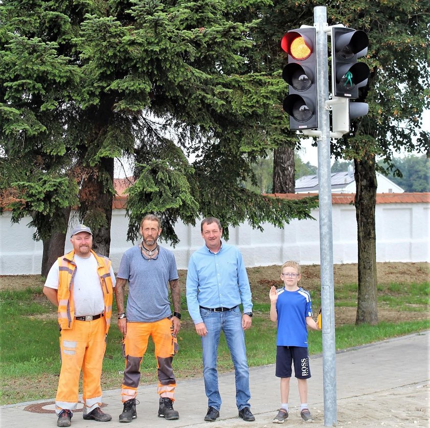 (ty) Rechtzeitig vor dem Beginn des neuen Schuljahrs hat Hohenwart eine fest installierte Fußgänger-Ampel bekommen, die den Schulweg im Bereich der Kreisstraße PAF13 noch sicherer machen soll. Die Signal-Anlage auf Höhe des Friedhofs wurde nach Angaben der Gemeinde-Verwaltung in der vergangenen Woche fertiggestellt. Sie befindet sich gegenüber der Schulstraße. "Der dafür notwendige Fußgängerweg wurde vom Bauhof in Eigenleistung angelegt", heißt es aus dem Rathaus. Vize-Bürgermeister Thomas Rolnik sowie die Bauhof-Mitarbeiter Marco Kempe und Franz Sedlmair trafen sich zum Besichtungs-Termin. Mit dabei: Thomas Rolnik junior. (Foto: Gemeinde Hohenwart)