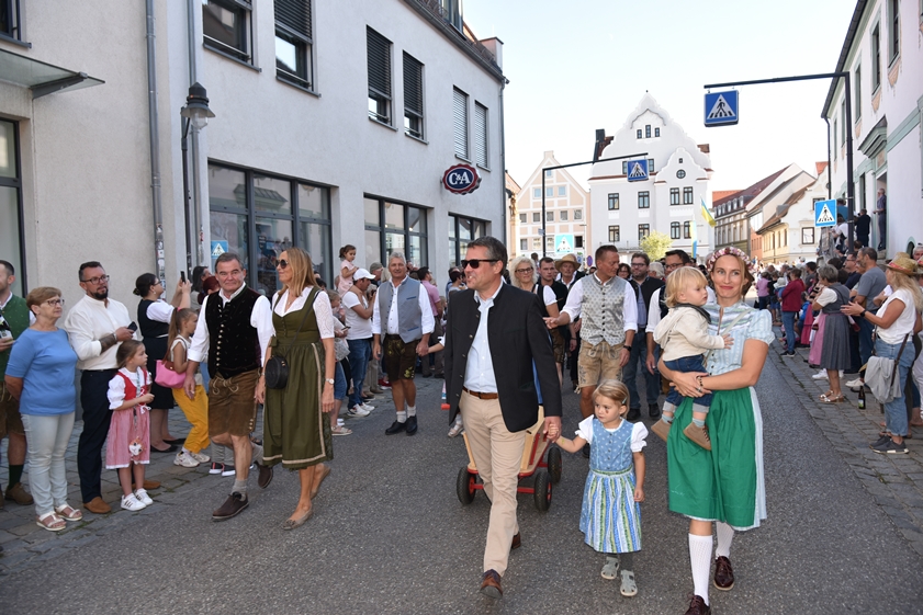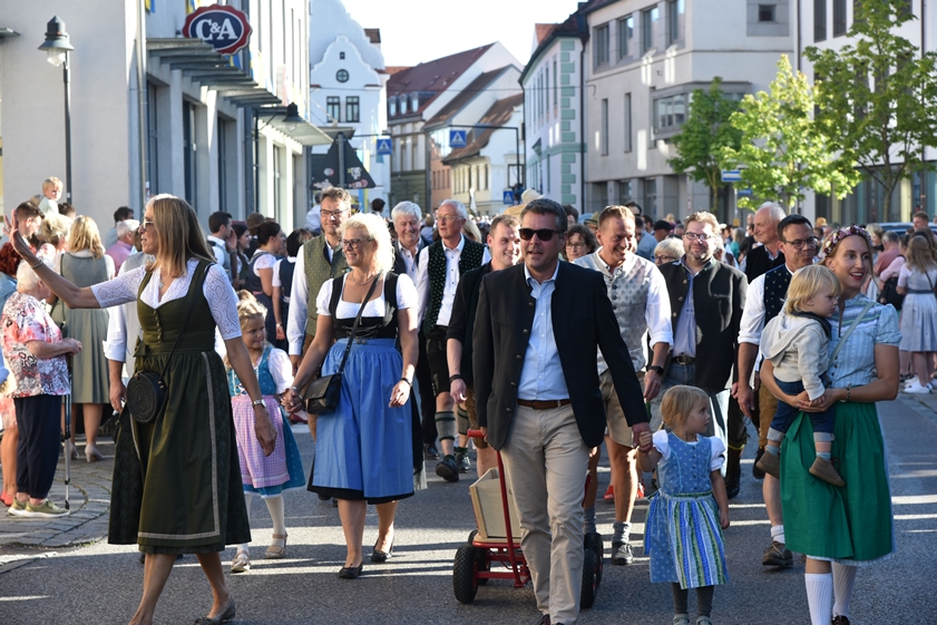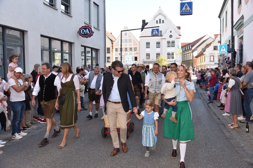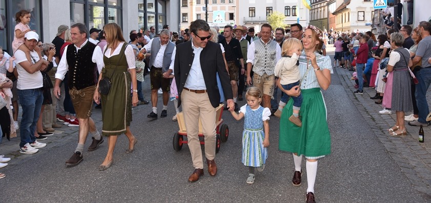 Beim Ausmarsch zum Festplatz: Landrat Albert Gürtner (links) mit Gattin sowie Bürgermeister Thomas Herker mit Ehefrau und Kindern.