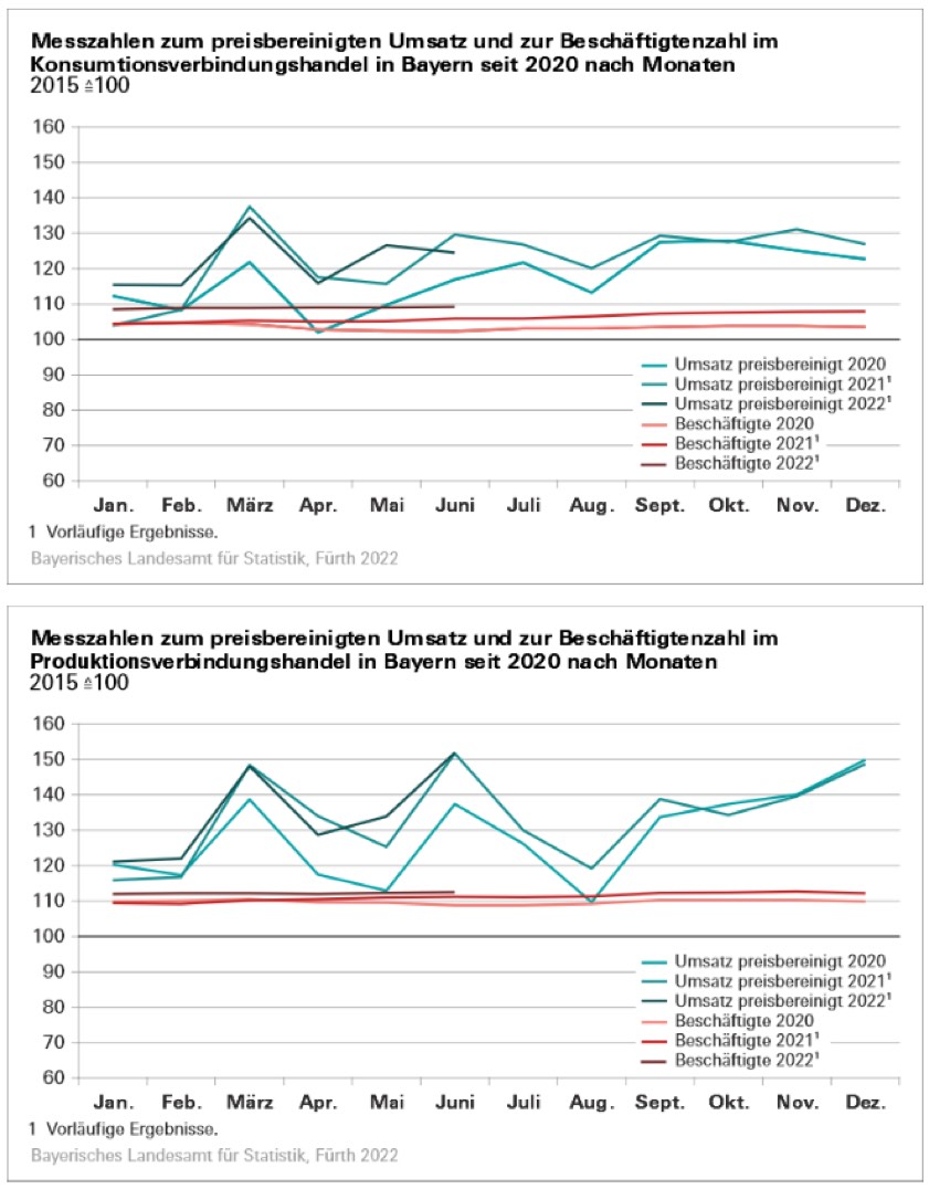 Eine nominale Umsatz-Steigerung bei realer Umsatz-Minderung im Vergleich zum Juni vergangenen Jahres verzeichnete auch der Konsumtions-Verbindungs-Handel. Der Umsatz im Produktions-Verbindungs-Handel und in der Handels-Vermittlung erhöhte sich im Juni 2022 zum Vorjahres-Monat sowohl nominal als auch real. Die Differenz zwischen nominaler und realer Steigerung ist dabei im Produktions-Verbindungs-Handel sichtlich hoch. So nahm der nominale Umsatz im Juni 2022 verglichen zum Juni 2021 um knapp 20 Prozent zu, während der reale Umsatz nur geringfügig mit 0,2 Prozent im Plus lag. Die Beschäftigtenzahl im bayerischen Großhandel (einschließlich der Handels-Vermittlung) wuchs im Juni 2022 im Vergleich zum Juni des vergangenen Jahres um 2,2 Prozent. Stark nahm die Zahl der Beschäftigten in der Handels-Vermittlung zu (4,6 Prozent).