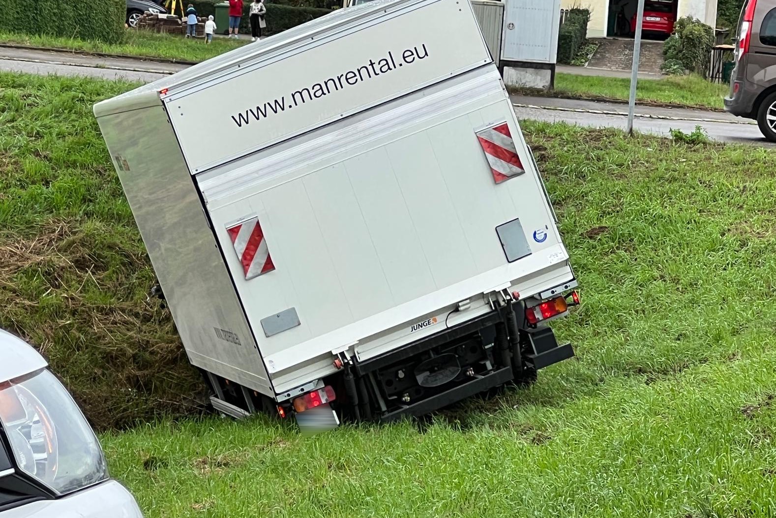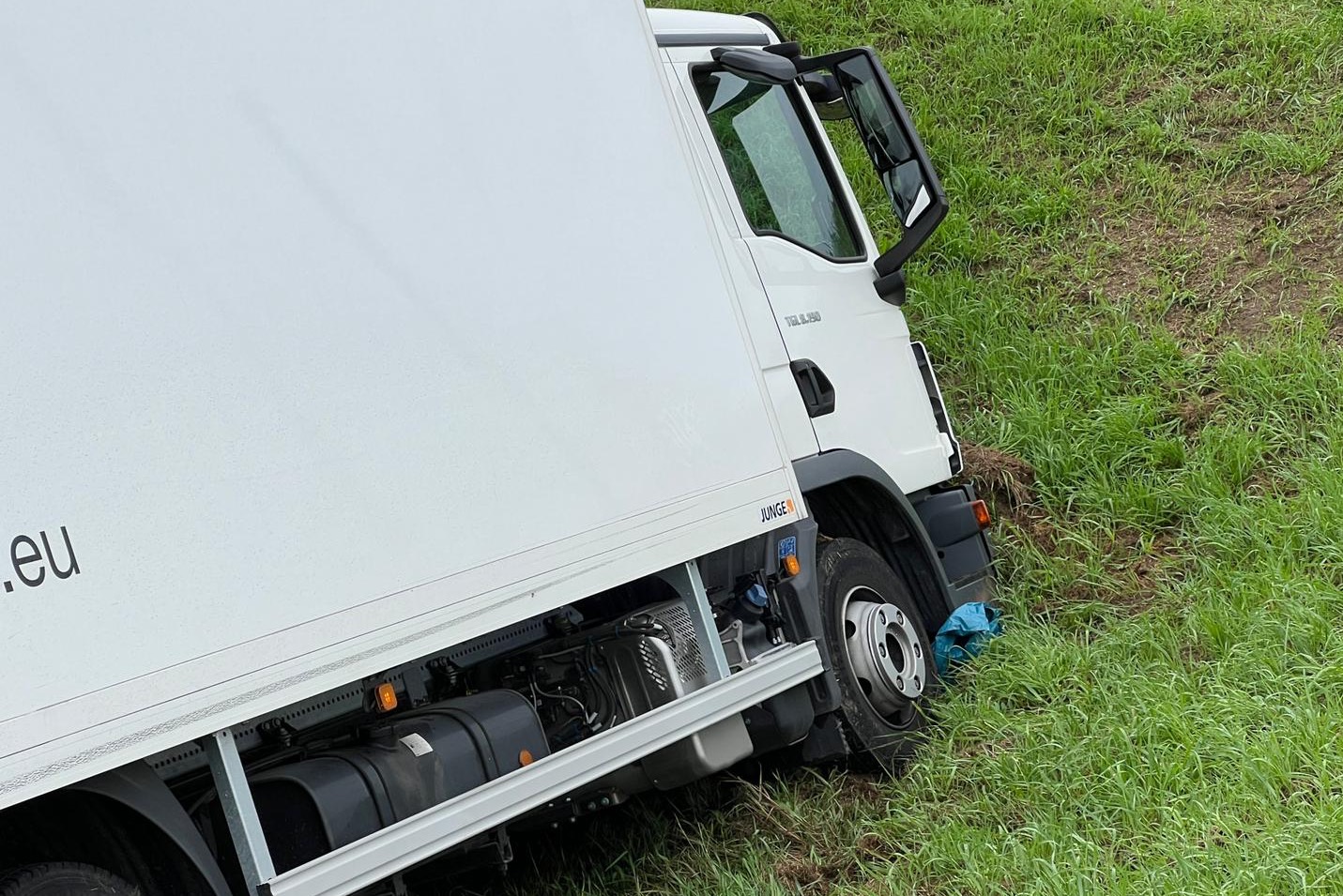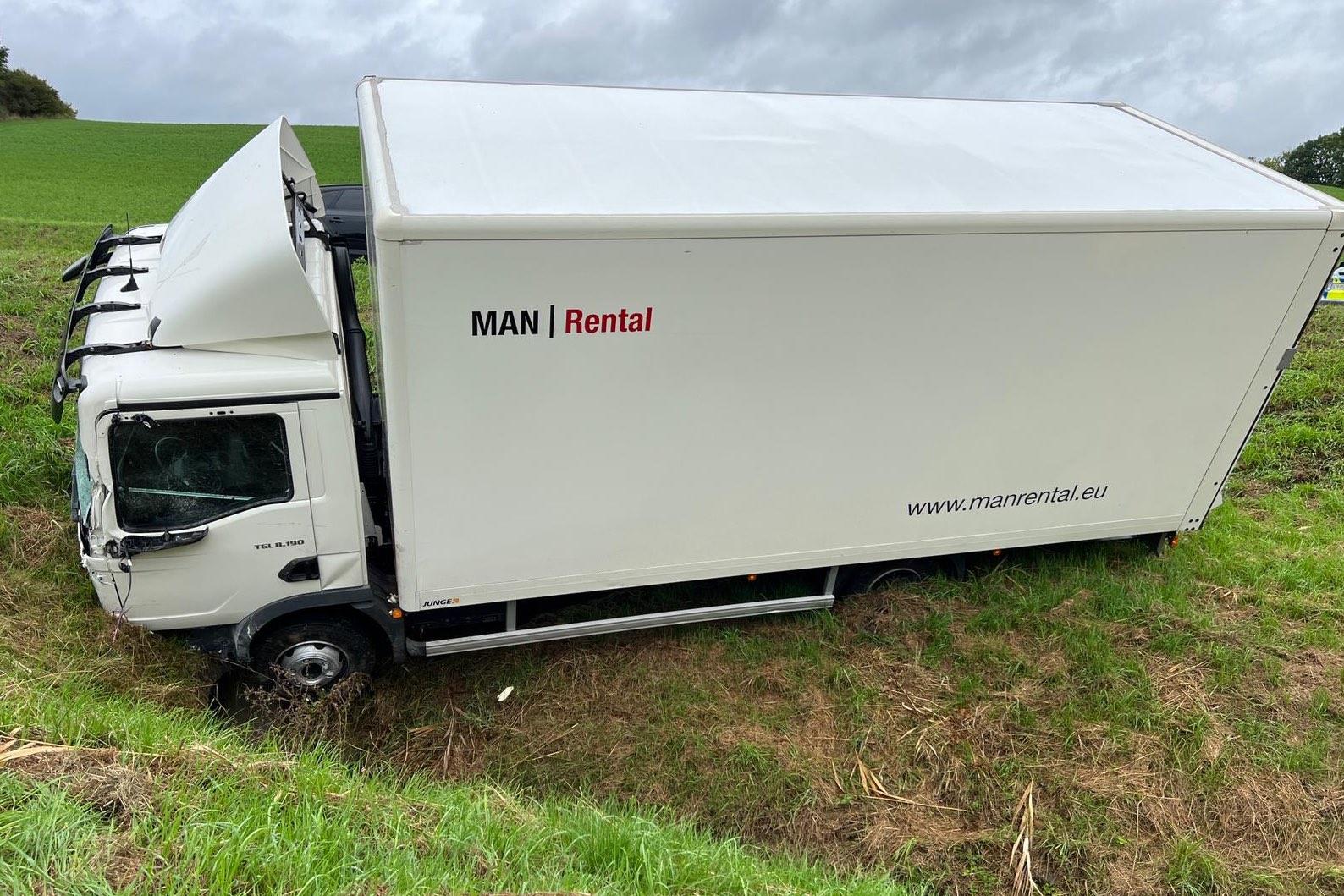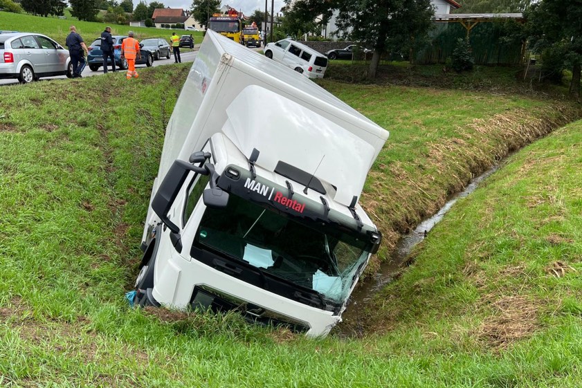 56-Jähriger geriet mit 7,5-Tonner in den Gegenverkehr, krachte gegen Pick-Up und VW-Bus, rauschte die Böschung hinab und gegen Wasser-Durchlass.