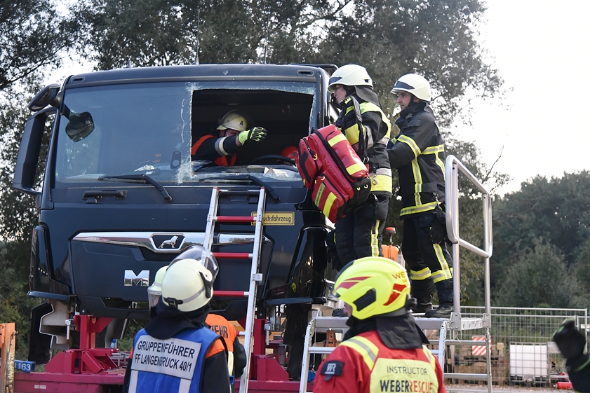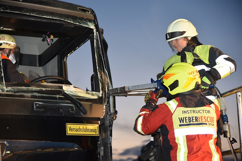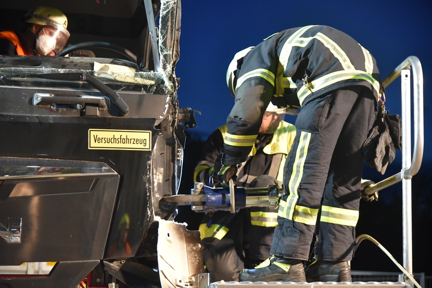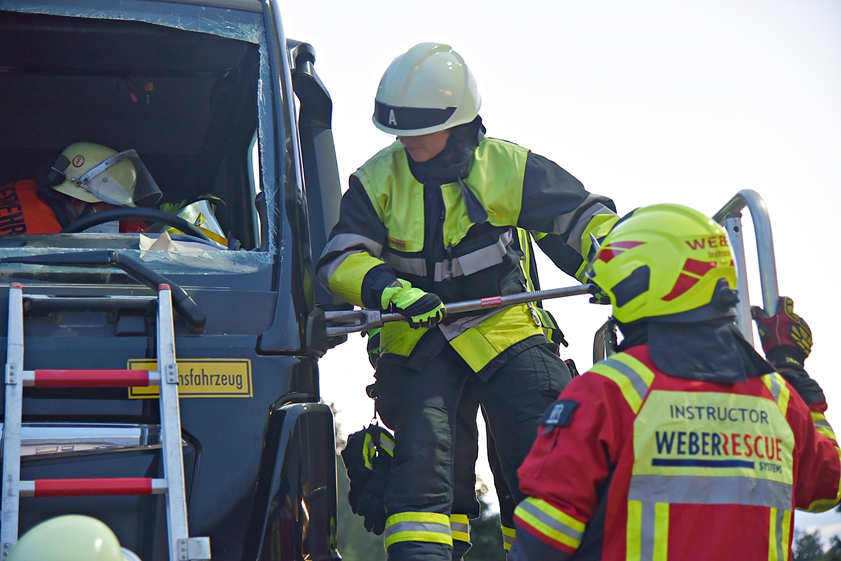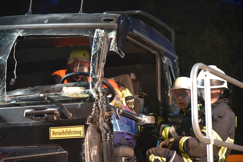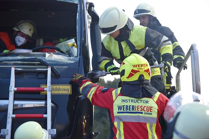 "Die Herausforderung bei Unfällen mit Lkw-Beteiligung ist die patientengerechte Rettung aus größerer Höhe als beim Pkw – und die zuvor notwendige Befreiung des Patienten aus einem stabilen Fahrzeug mit schwereren Bauteilen und anderer Verarbeitung", erklärt Lehner. Durch die verstärkten Frontbereiche gerieten etwa die Schneidgeräte und damit auch deren Bediener an die Belastungsgrenze. Außerdem: "Die Verletzungs-Muster der Verunglückten im Lkw sind häufig auch komplett anders als bei im Auto verunfallten Menschen", so Lehner. Geübt werde aber auch die Eigensicherung. Und: "Neben der Absicherung sind der Brandschutz zu beachten, die Ladungs-Sicherung und viele andere, sehr komplexe Dinge."