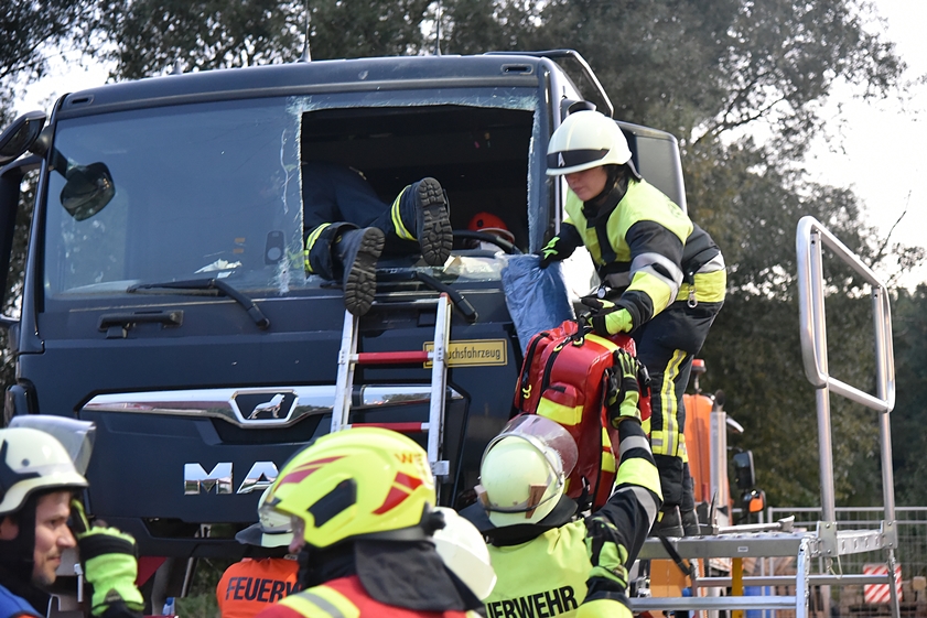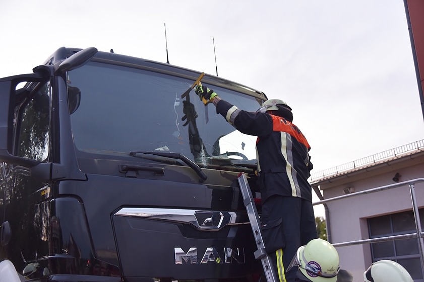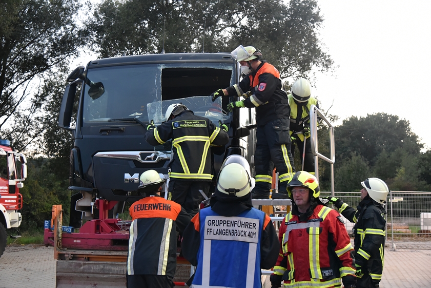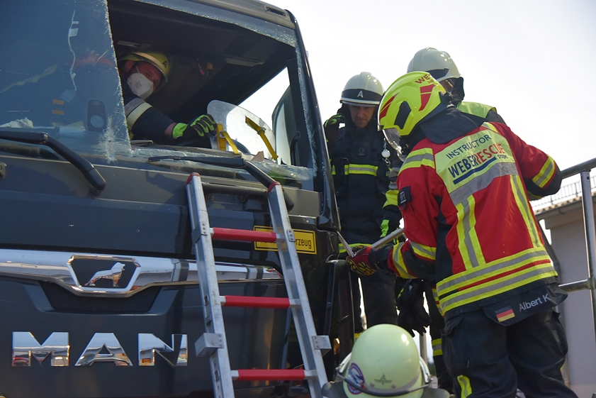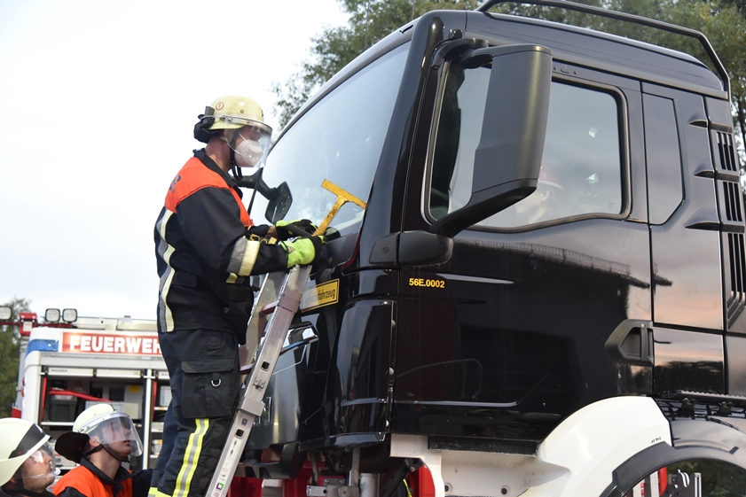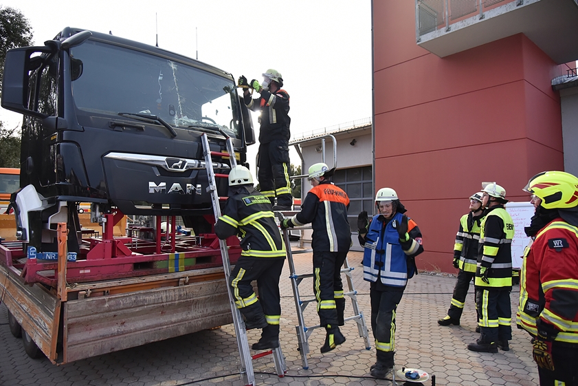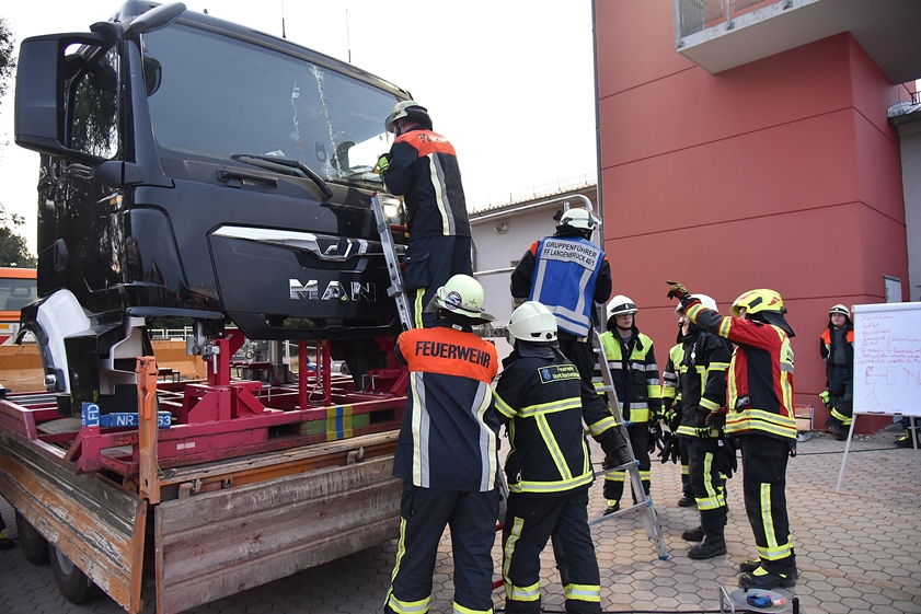 Kommandant Jürgen Lehner organisierte für eine Spezial-Übung nicht nur eine nagelneue Lkw-Fahrer-Kabine, sondern zudem einen ausgewiesenen Experten.