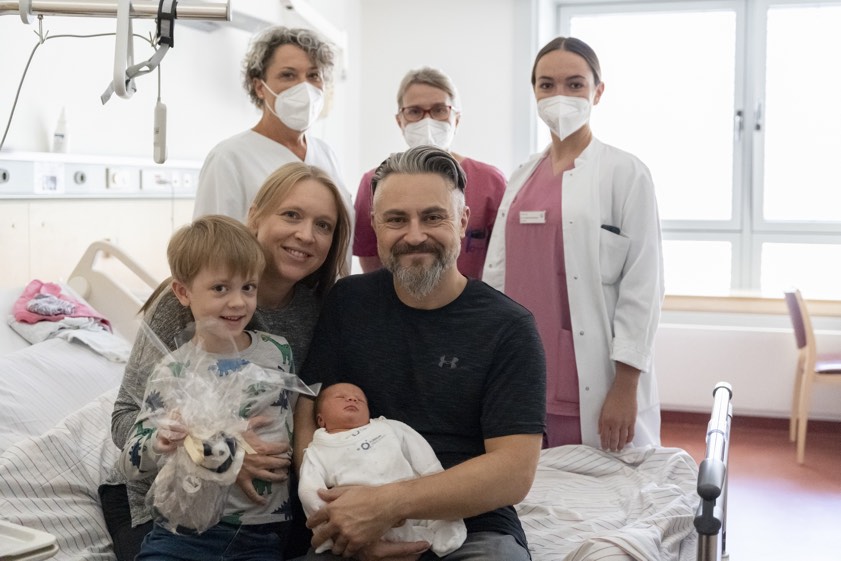 Glückwünsche und ein Stofftier für das Neugeborene überbrachten stellvertretend die Stations-Leiterin Petra Weißbach, Oberärztin Sabine Schmid und Assistenz-Ärztin Lisa Bleckwedel-Rolack. Zum Abholen des Familien-Zuwachses kam nicht nur der Vater, sondern auch der künftige große Bruder Maximilian.
