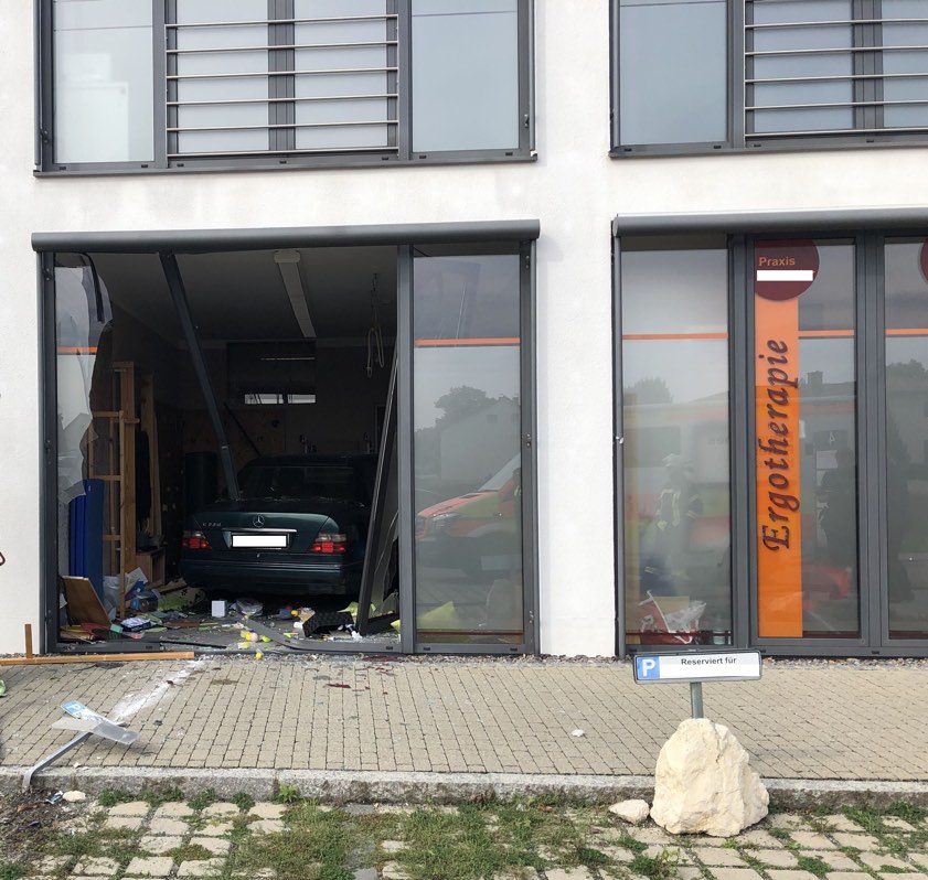 (ty) Ein ebenso ungewöhnlicher wie folgenreicher Verkehrsunfall hat sich am heutigen Vormittag in Tegernheim im Landkreis Regensburg ereignet. Das Unglück geschah gegen 10 Uhr an der Von-Heyden-Straße. Eine 82 Jahre alte Frau wollte laut Schilderung der Polizei mit ihrem Mercedes, der mit einem Automatik-Getriebe ausgestattet ist, auf den Stellplätzen vor einer Ergotherapie-Praxis vorwärts einparken. Dabei sei der Wagen allerdings vorwärts durch die verglaste Gebäude-Front gekracht und mitten in einem Behandlungsraum zum Stehen gekommen. "Zum Zeitpunkt des Geschehens befanden sich dort drei Personen", meldet die Polizei: "Zwei Personen wurden leicht, eine Person mittelschwer verletzt."