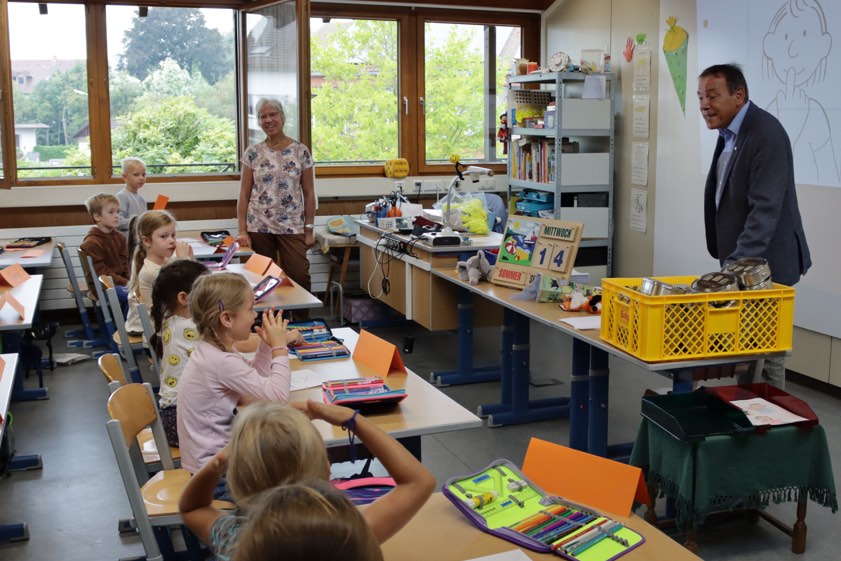Die 64 Erstklässler der Grundschule in Schrobenhausen-Mühlried hatten sich bereits in der Aula versammelt, um Bürgermeister Reisner zu begrüßen. Im Halbkreis aufgestellt, lauschten sie den Worten des Rathaus-Chefs, der ihnen einen erfolgreichen Schulanfang wünschte und die Brotzeit-Boxen verteilte. Danach ging es für die Sprösslinge zurück in die Klassenzimmer, um gemeinsam den Inhalt der Boxen zu erkunden. In der Franziska-Umfahrer-Grundschule wurden Reisner und Kern von Rektorin Andrea Koch in Empfang genommen. Gemeinsam besuchten sie dann die vier ersten Klassen und überreichten den Abc-Schützen die Brotzeit-Boxen.
