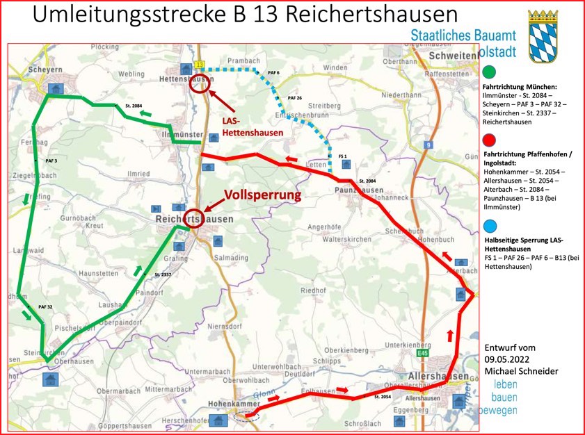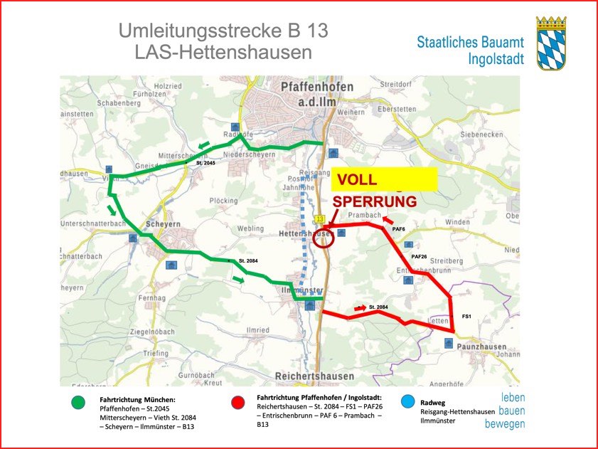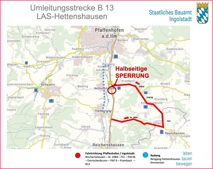 Wegen dieser Bauarbeiten müsse die Bundesstraße halbseitig beziehungsweise vollständig gesperrt werden. Im Rahmen der halbseitigen Sperrung der B13 werde der Verkehr in Fahrtrichtung Pfaffenhofen über die Staatsstraße 2084 in Richtung Paunzhausen, FS1, PAF26, Entrischenbrunn und PAF6 umgeleitet. Der Verkehr in Fahrtrichtung München werde indes durch die B13-Baustelle geführt. Während der Vollsperrung der B13 werde der Verkehr in Fahrtrichtung München dann über die Staatsstraße 2084, Pfaffenhofen, Vieth, Scheyern und Ilmmünster geleitet. Folgende vier Bauabschnitte und Maßnahmen sind nach offiziellen Angaben des staatlichen Bauamts bei Hettenshausen vorgesehen: