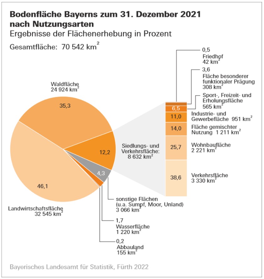 (ty) Laut den jüngsten Auswertungen des Liegenschafts-Kataster-Informations-Systems (Alkis) der Vermessungs-Verwaltung durch das bayerische Landesamt für Statistik hat sich die Siedlungs- und Verkehrsfläche – ohne Bergbau und Tagebau, Grube, Steinbruch – im Freistaat zum Ende des vergangenen Jahres auf insgesamt 863 192 Hektar belaufen. Das entspricht 12,2 Prozent der bayerischen Landesfläche mit insgesamt 70 542 Quadratkilometern, wie heute mitgeteilt wurde.