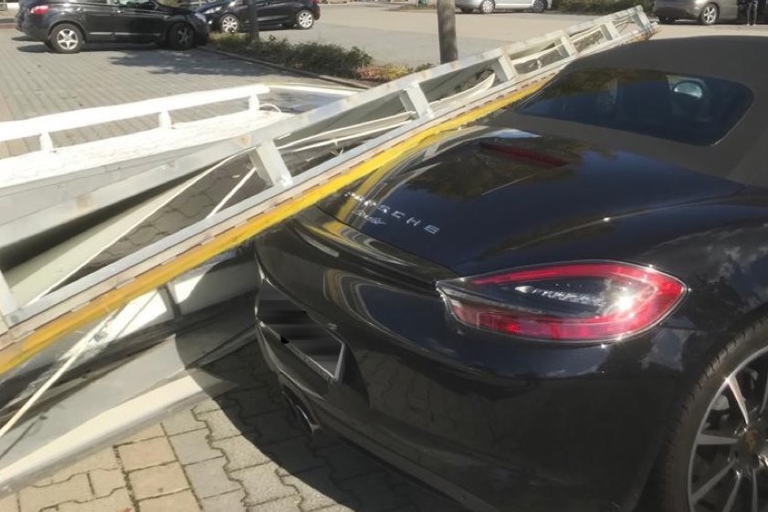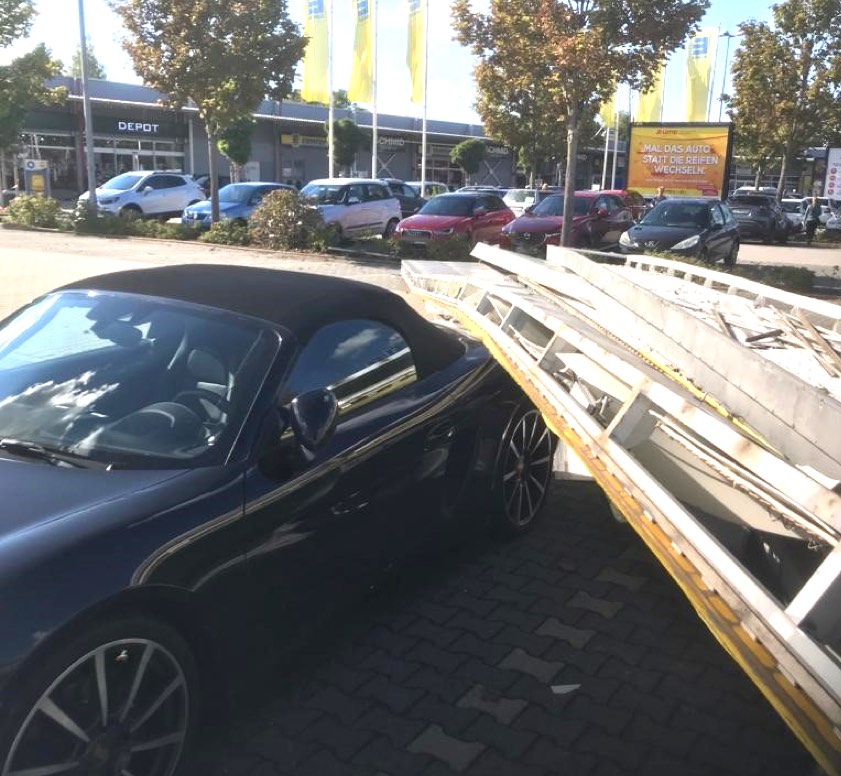 Nach Angaben der örtlichen Polizeiinspektion steuerte die 81-Jährige, die auch in Neuburg an der Donau wohnt, auf dem Parkplatz des Südparks mit ihrem Pkw zunächst über die bepflanzte, bauliche Abtrennung einer Parkreihe. Dabei sei die Front ihres Wagens an einem abmontierten Reklame-Schild hängen geblieben, das dort gelagert worden sei. Dieses Schild sei anschließend vom Auto der Seniorin einige Meter mitgezogen worden. Ein Teil dieses ungefähr 15 Meter langen und zwei Meter breiten Metall-Schildes sei schließlich auf einem geparkten Porsche gelandet. Die Rentnerin habe daraufhin den Rückwärtsgang eingelegt – und die Unfall-Tour ging weiter.