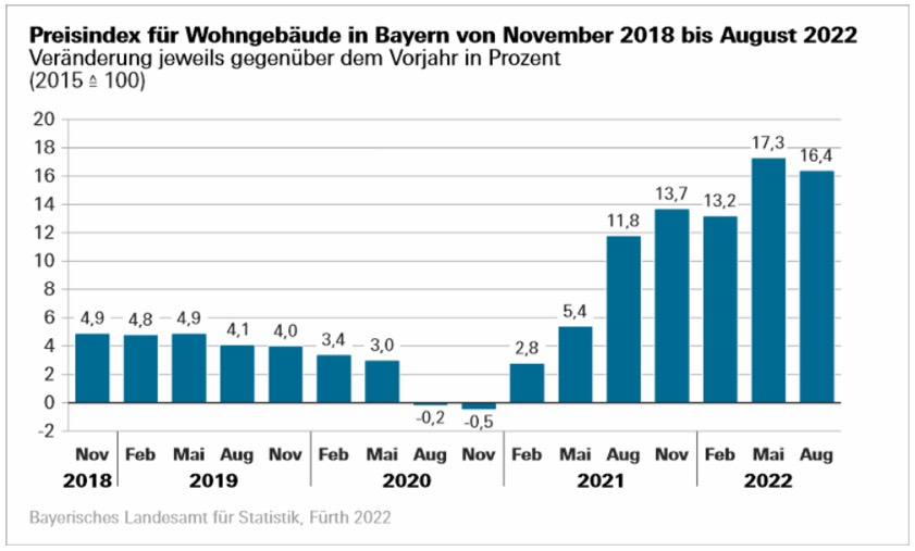 (ty) Der Preisindex für den Neubau von Wohngebäuden im Freistaat hat im August dieses Jahres einen Stand von 150,4 erreicht (2015≙100). Im Vergleich zum entsprechenden Vorjahres-Monat bedeutet dies eine durchschnittliche Preissteigerung von 16,4 Prozent (siehe auch Grafik unten). Das wurde heute aus dem bayerischen Landesamt für Statistik gemeldet. Im Bereich der Rohbau-Arbeiten klettern die Preise im Vorjahres-Vergleich um 14,1 Prozent. Die höchsten Zuwachsraten verzeichneten die Experten des bayerischen Landesamts für Statistik bei Stahlbau-Arbeiten (plus 20,4 Prozent) sowie bei Abdichtungs-Arbeiten (plus 19,9 Prozent).