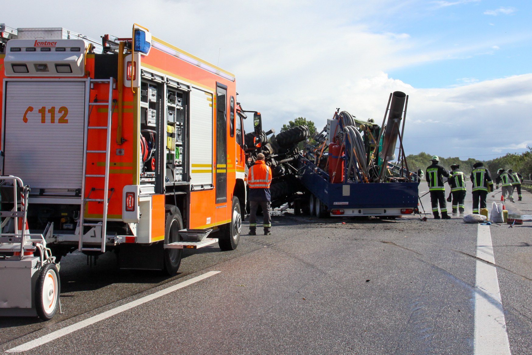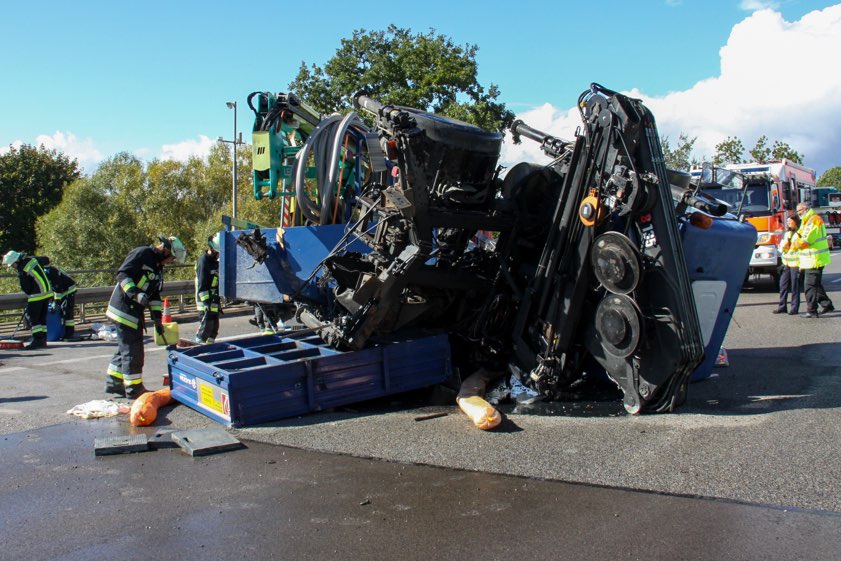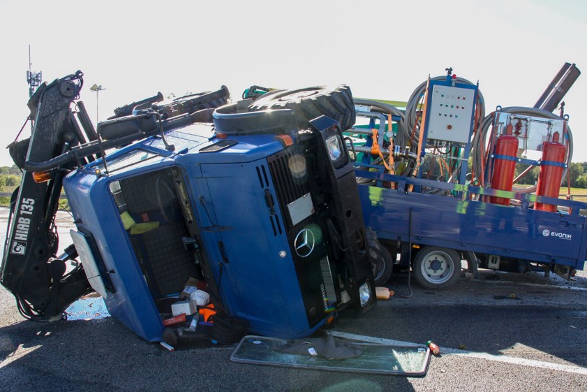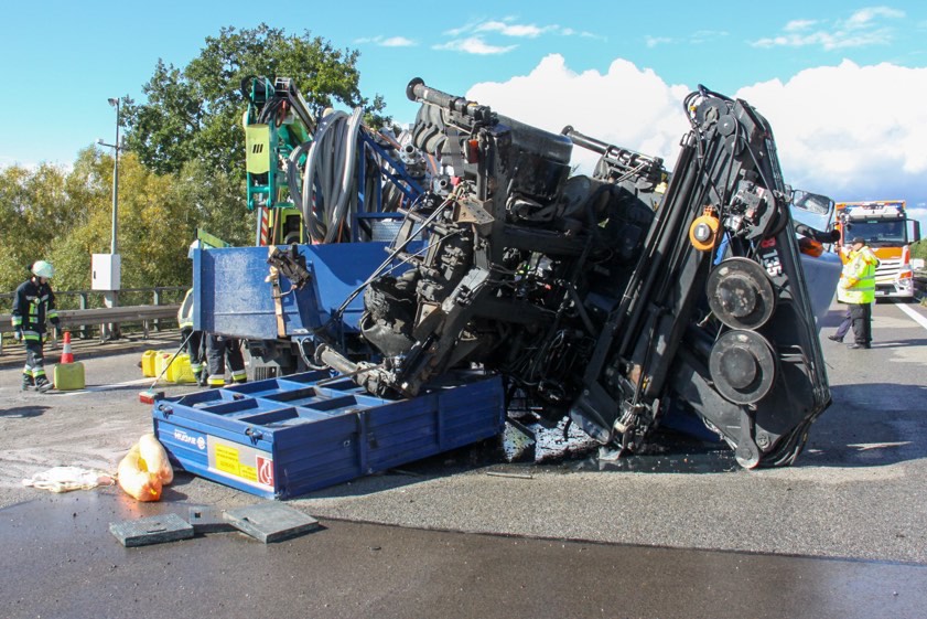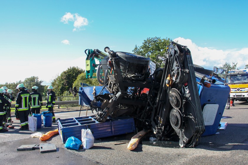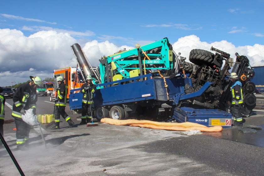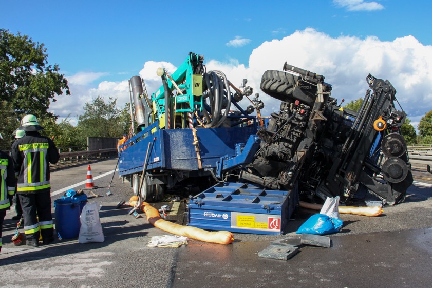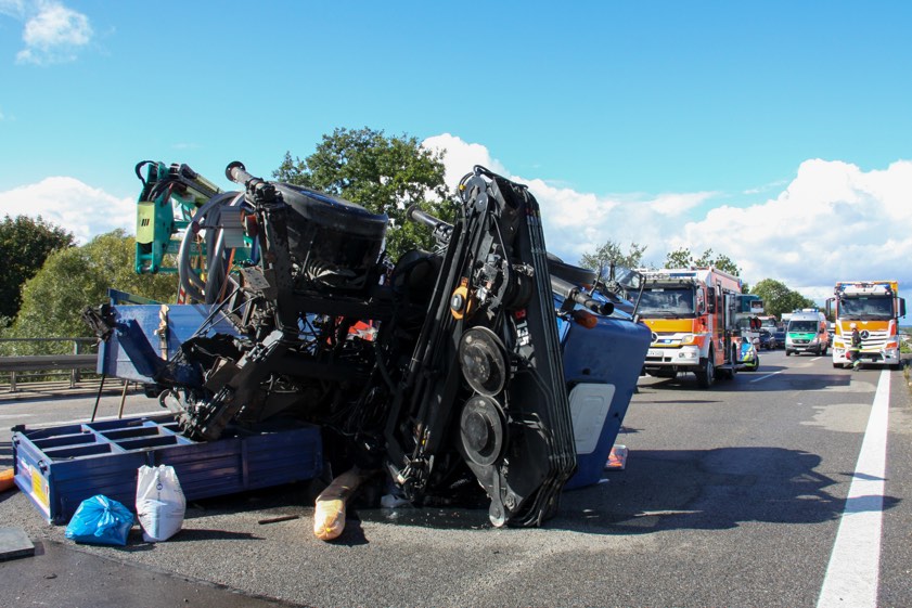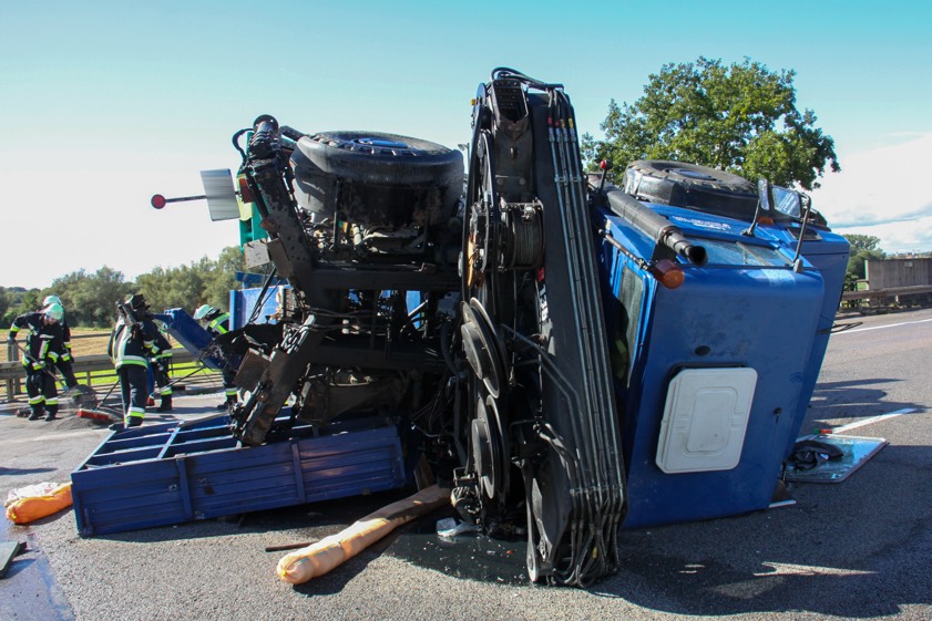Nach einem Reifen-Platzer kippte ein Unimog, der einen Anhänger im Schlepptau hatte, mitten auf der Autobahn um.