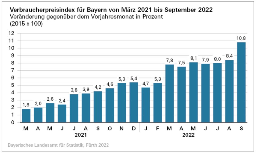 Die Inflationsrate, gemessen als prozentuale Veränderung des Verbraucherpreis-Index für Bayern gegenüber dem entsprechenden Vorjahres-Monat, liege in diesem September bei 10,8 Prozent. Der Gesamt-Index ohne die aktuellen Hauptpreistreiber Nahrungsmittel und Energie, in der öffentlichen Diskussion oft als Kerninflationsrate bezeichnet, belaufe sich im September auf 4,9 Prozent. Gegenüber dem Vormonat stieg der Verbraucherpreis-Index im September um 2,2 Prozent.