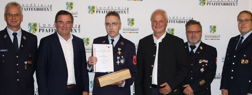 Peter Demmelmeir (Dritter von links) wurde für sein langjähriges Engagement als Kassier bei der Feuerwehr von Gerolsbach geehrt. Mit auf dem Bild, von links: Kommandant Thomas Daschner, Landrat Albert Gürtner, der Gerolsbacher Bürgermeister Martin Seitz, Kreisbrandrat Armin Wiesbeck und der Gerolsbacher Feuerwehr-Vorsitzende Johann Lachner.