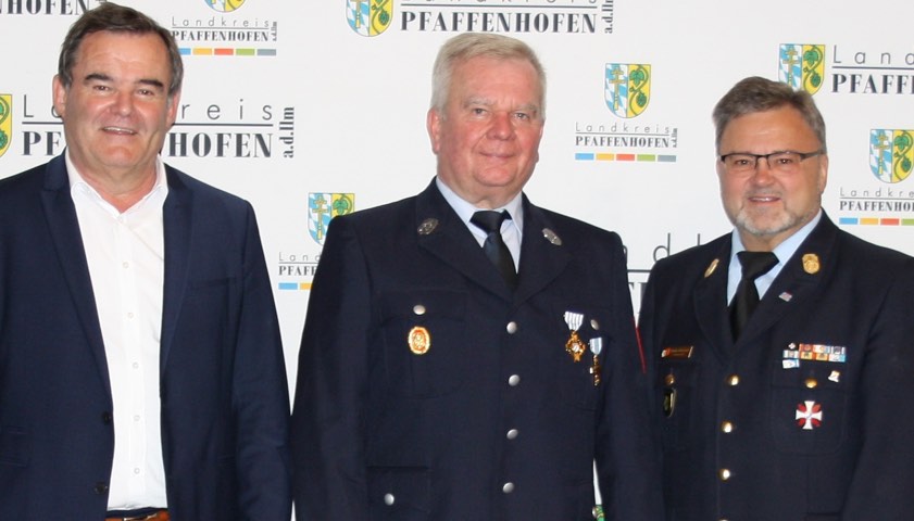 Franz-Xaver Koller (Mitte) wurde für 50 Jahre aktiven Feuerwehr-Dienst von Landrat Albert Gürtner (links) und Kreisbrandrat Armin Wiesbeck geehrt.