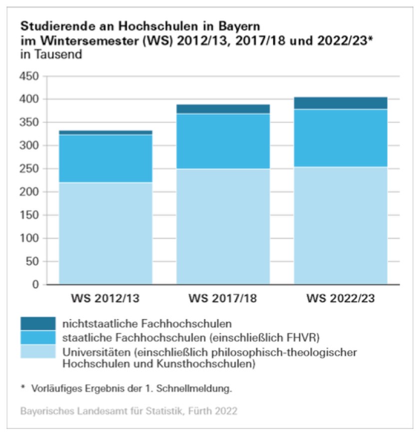 (ty) Wie das bayerische Landesamt für Statistik jetzt mitgeteilt hat, werden im Winter-Semester 2022/23 im Freistaat insgesamt 404 823 Studierende an Hochschulen immatrikuliert sein. Damit erreicht die Gesamtzahl der Studierenden nach den ersten, zum Teil noch auf Schätzungen beruhenden Meldungen der Studierenden-Kanzleien, einen neuen Höchststand. Im Vergleich zu den 404 090 Studierenden im vorangegangenen Winter-Semester beträgt die Steigerung 0,9 Prozent. Gleichzeitig stieg die Zahl der Erst-Immatrikulationen von 63 404 auf nun 63 969 um 0,9 Prozent.