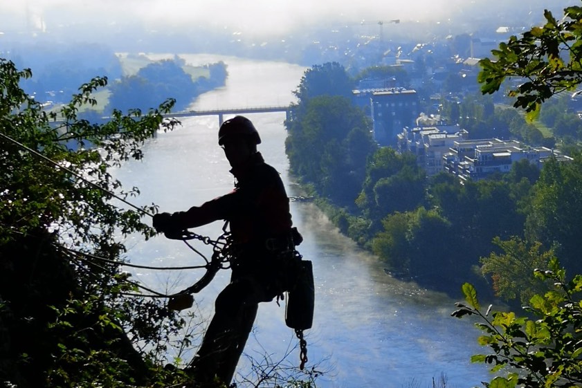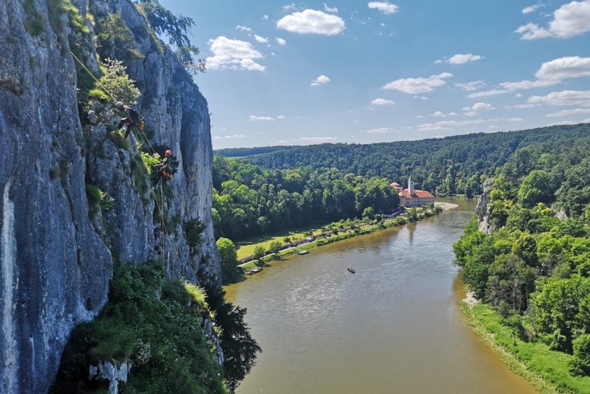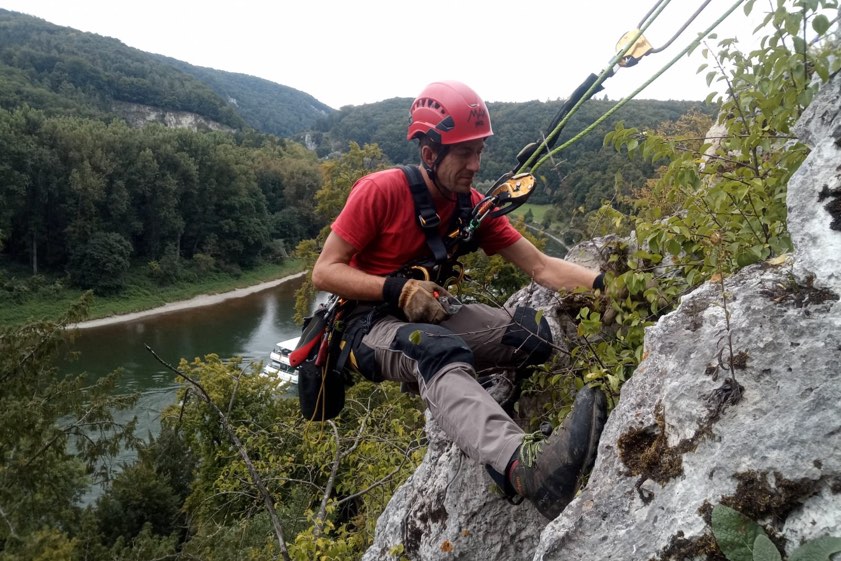 "Wichtig ist, dass die Arbeiter die Pflanzen nicht berühren, da dies zusammen mit der prallen Sonne zu schlimmen Verbrennungen führen kann", weiß Ilgenfritz weiter. Mit der Methode der Kletterseil-Technik werde der nachwachsende Gehölz-Aufwuchs an den Felskanten und auf den Felsbändern zurückgenommen. "Es ist zwar sehr anstrengend, aber auch wunderschön, in der Weltenburger Enge diese Arbeit für die Natur zu leisten", sagt Armin Ilgenfritz und bestätigt: "In den steilen Felsen, über dem Wasser hängend, ist es selbst für uns eine besondere Herausforderung."