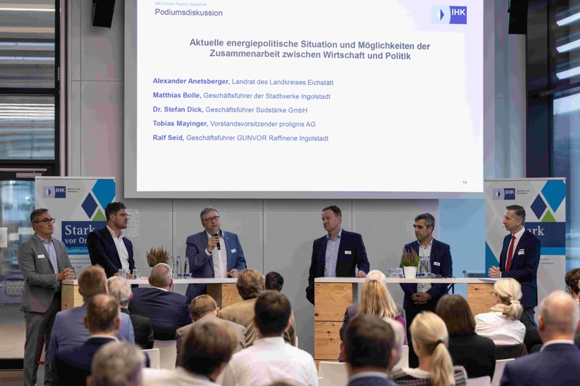 Wie die Unternehmen versuchen, die vielfältigen Probleme und Herausforderungen der Energiekrise zu meistern, darüber berichteten im Podiums-Talk dann Matthias Bolle (Geschäftsführer der Stadtwerke Ingolstadt), Stefan Dick (Geschäftsführer der Südstärke-GmbH aus Schrobenhausen), Tobias Mayinger (Vorstands-Vorsitzender der Ingolstädter Prolignis-AG) sowie Ralf Seid (Geschäftsführer der Gunvor-Raffinerie Ingolstadt). "Mit ihren Beiträgen gaben sie Impulse für den anschließenden Austausch mit den Gästen des Forums", fasste die IHK heute in einer Presse-Mitteilung zusammen.