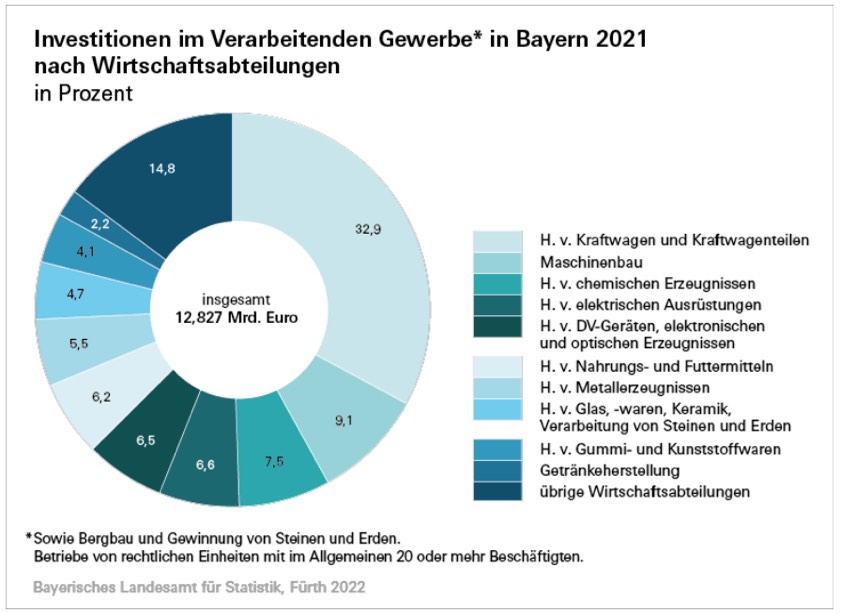 Investitionsstärkster Wirtschafts-Zweig in Bayern war auch im Jahr 2021 die "Herstellung von Kraftwagen und Kraftwagenteilen". Deren Anteil am gesamten bayerischen Investitions-Volumen betrug 32,9 Prozent. Mit gut 4,2 Milliarden Euro wurden in diesem Sektor im Vorjahres-Vergleich um 8,2 Prozent mehr Investitionen getätigt. An zweiter Stelle stand mit einem Anteil von 9,1 Prozent an den Gesamt-Investitionen der "Maschinenbau" (1,2 Milliarden Euro; minus 3,3 Prozent) gefolgt von der "Herstellung von chemischen Erzeugnissen" mit einem Anteil von 7,5 Prozent (1,0 Milliarden Euro; plus 12,3 Prozent).