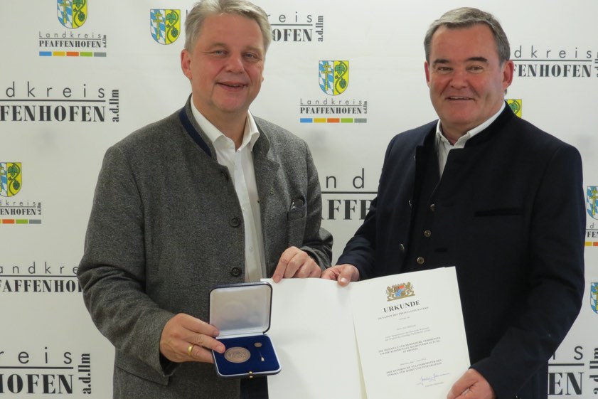 (ty) Im Rahmen der jüngsten Sitzung des Pfaffenhofener Kreistags am vergangenen Montagnachmittag hat Landrat Albert Gürtner (Freie Wähler) die kommunale Verdienst-Medaille in Bronze an Jens Machold (CSU) verliehen. Machold ist seit 14 Jahren der Rathaus-Chef von Wolnzach und seit zwei Jahrzehnten durchgehend Mitglied des Kreistags. Seit mehr als 30 Jahren ist der gelernte Jurist mittlerweile schon in der Kommunalpolitik für seine Heimat-Gemeinde tätig.
