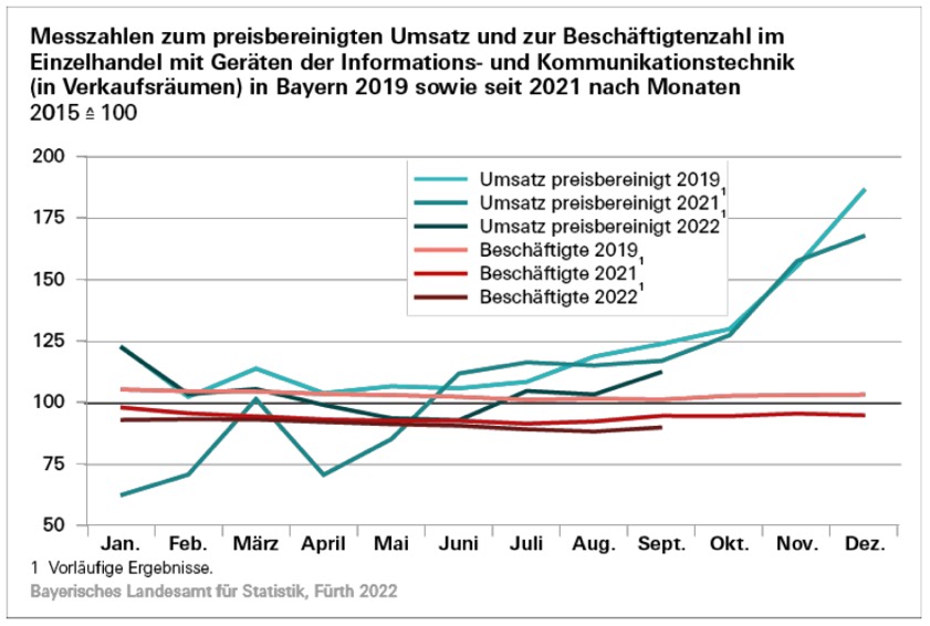 (ty) Wie das bayerische Landesamt für Statistik nach den ersten, vorläufigen Ergebnissen der "Monats-Statistik im Einzelhandel" mitgeteilt hat, ist der Umsatz im bayerischen Einzelhandel (ohne Kraftfahrzeug-Handel) in den ersten neun Monaten des laufenden Jahres im Vergleich zum Vorjahres-Zeitraum nominal um 5,8 Prozent gestiegen, hat jedoch preisbereinigt um 1,7 Prozent abgenommen. Die Beschäftigtenzahl blieb konstant. Im September dieses Jahres wuchs der nominale Umsatz des Einzelhandels gegenüber dem September vergangenen Jahres um 8,6 Prozent, während der preisbereinigte Umsatz um 1,9 Prozent sank. Im Vergleich zum Ferienmonat August steigt der Umsatz im September um 4,8 Prozent. Die Zahl der Beschäftigten erhöhte sich um 1,0 Prozent.