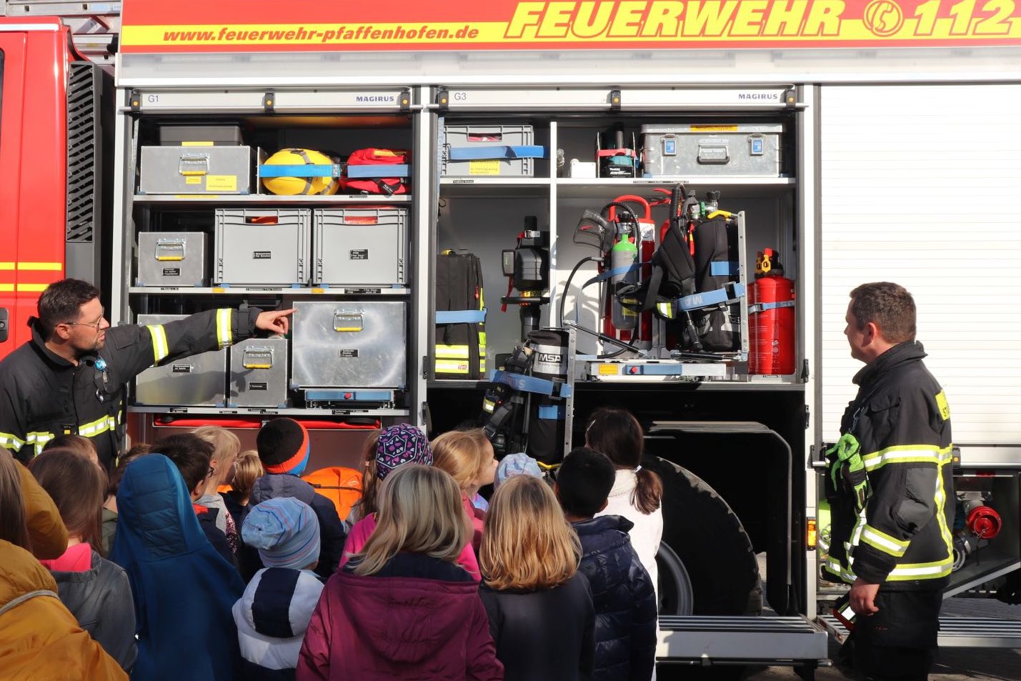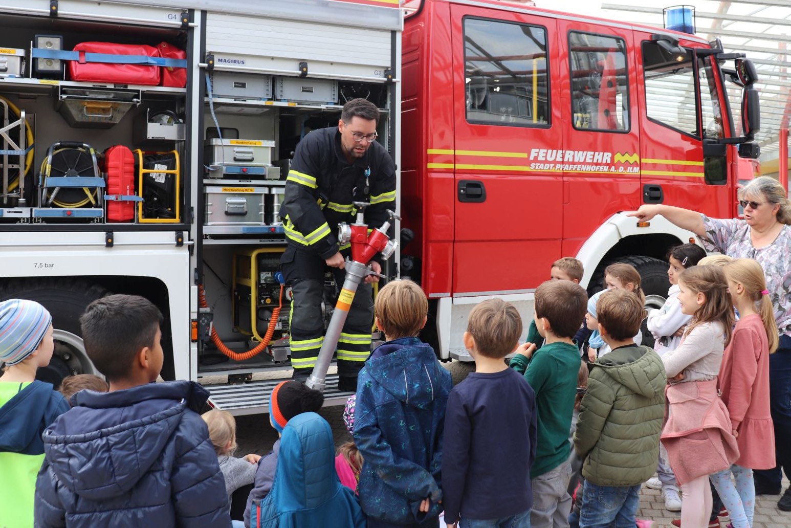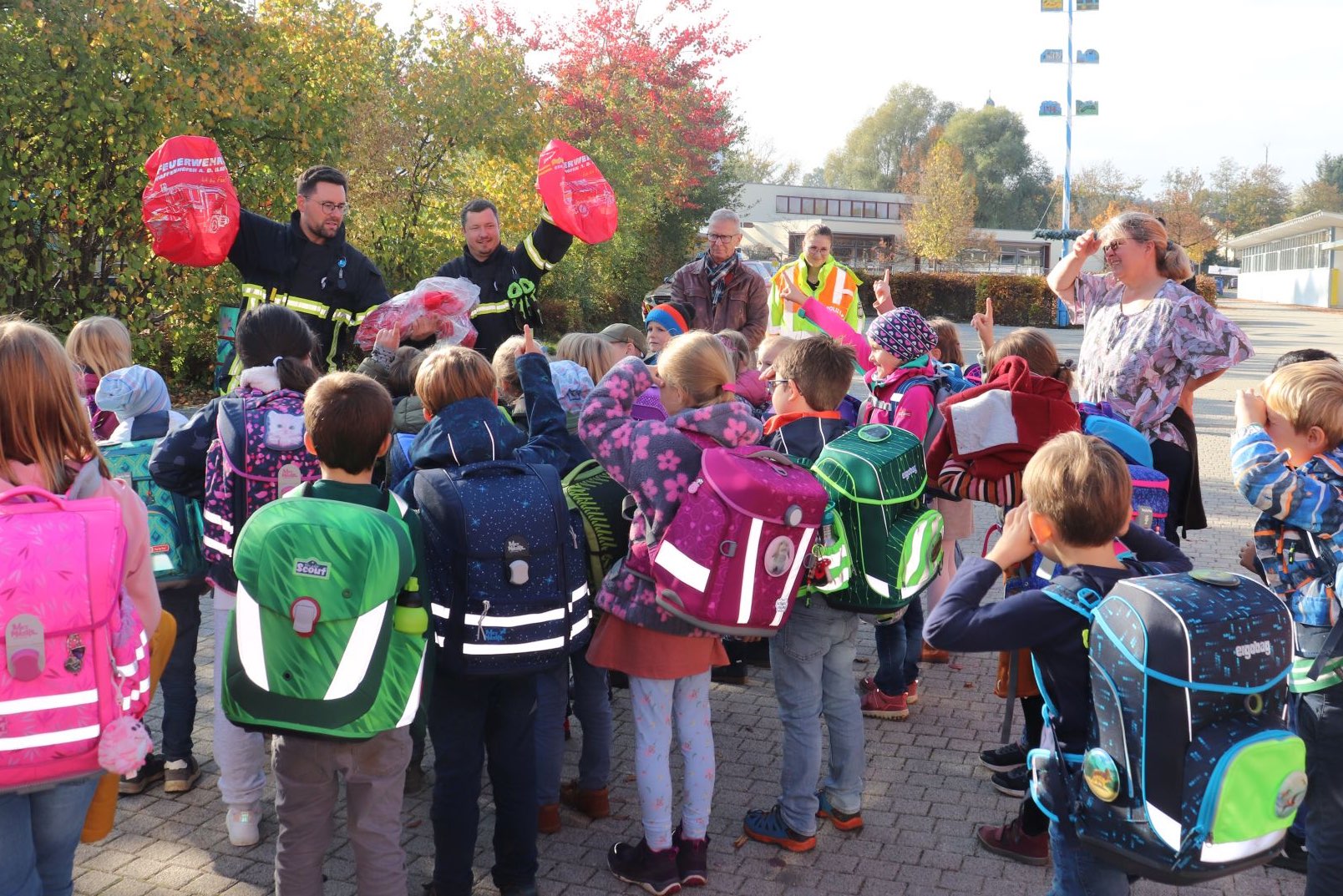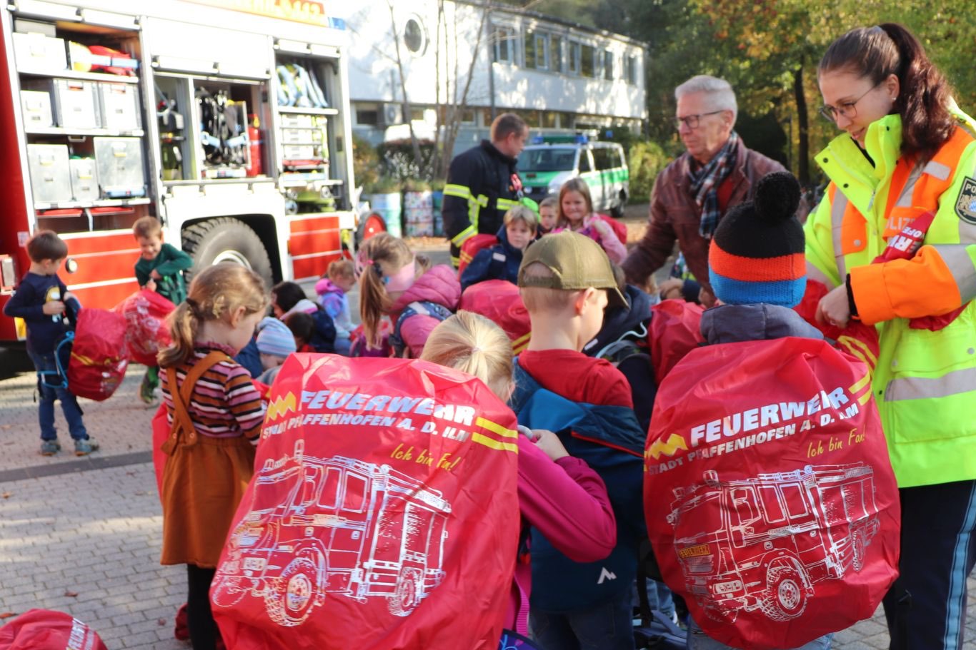 Nacheinander seien alle drei Pfaffenhofener Grundschulen angefahren und Rucksack-Cover an knapp 300 Abc-Schützen übergeben worden. "Wahrhaftig gelungen!" Mit diesen Worten fasst Roland Seemüller, Erster Kommandant der Kreisstadt-Feuerwehr die Idee mit den Rucksack-Covern und der Übergabe zusammen. Das offizielle Gruppenfoto (ganz oben) wurde mit der Klasse 1a der Grundschule in Niederscheyern gemacht. Mit dabei: Klassen-Lehrerin Susanne Riebold, Rektorin Sabine Fröhlich, Vize-Bürgermeister Roland Dörfler und Constanze Reger von der Polizeiinspektion in Pfaffenhofen.