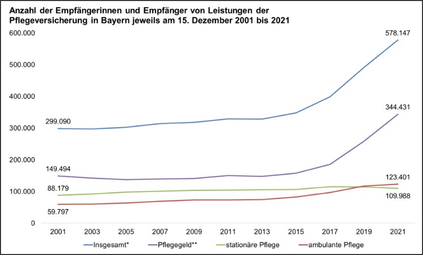 (ty) Insgesamt 578 147 Menschen haben zum Ende des vergangenen Jahres im Freistaat Leistungen der Pflege-Versicherung erhalten. "Das entspricht seit der letzten Erhebung im Jahr 2019 einer Zunahme von 17,5 Prozent", teilte das bayerische Landesamt für Statistik jetzt mit. Insgesamt habe sich die Zahl seit 2001 nahezu verdoppelt; damals waren es 299 090 Personen.