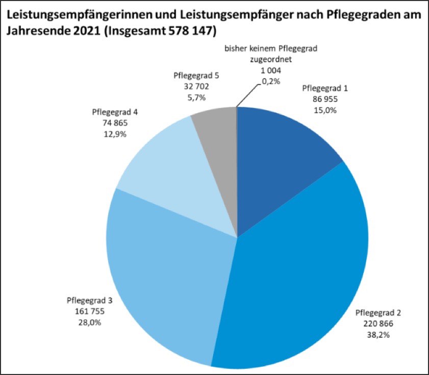 Insgesamt erhielten 273 208 Menschen mit Pflegegrad 2 bis 5 ausschließlich Pflegegeld, 71 223 Pflegebedürftige mit Pflegegrad 1 ausschließlich Leistungen der nach Landesrecht anerkannten Angebote zur Unterstützung im Alltag beziehungsweise ohne ambulante oder stationäre Pflegeleistungen. 327 Pflegebedürftige mit Pflegegrad 1 nutzten teilstationäre Leistungen.