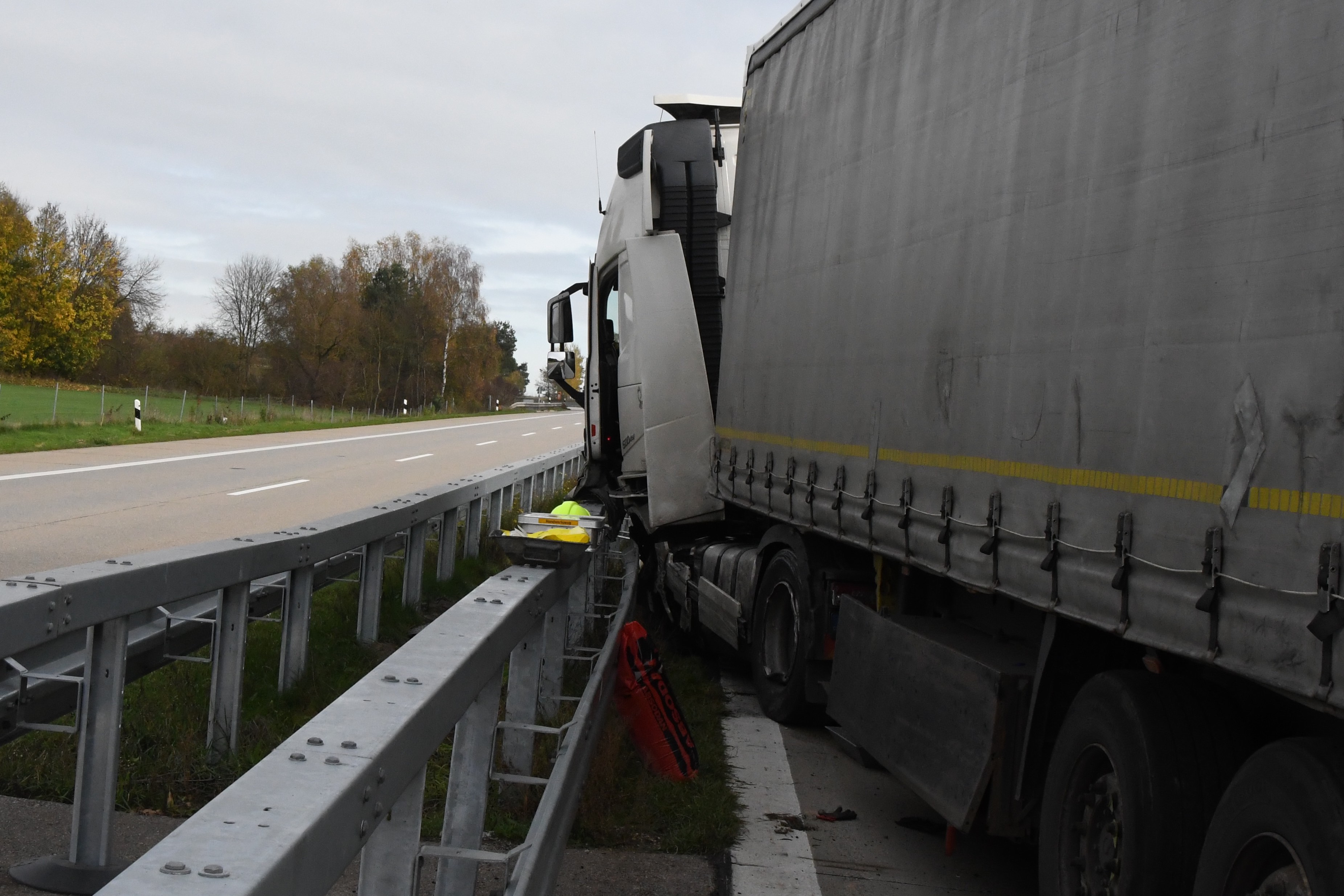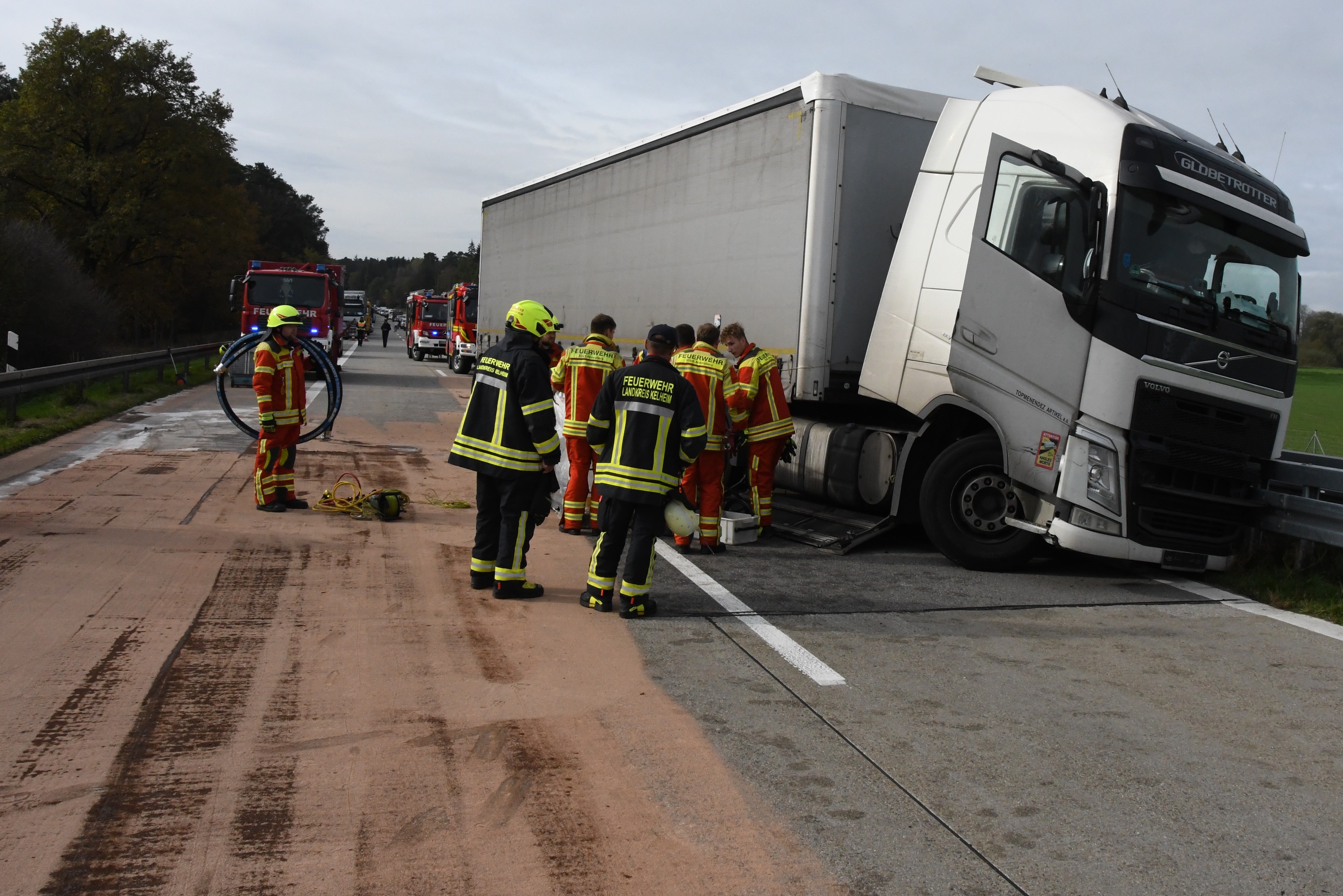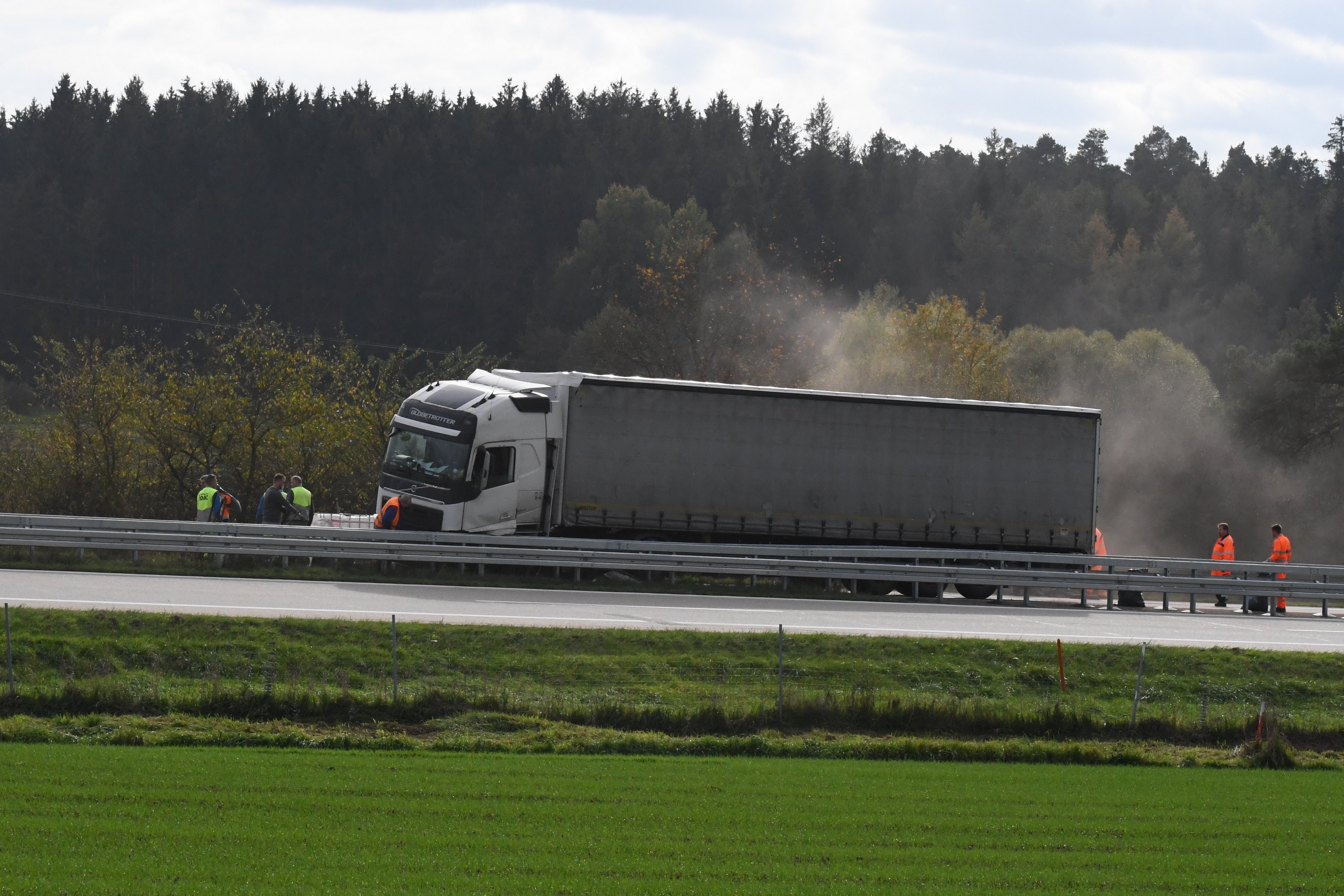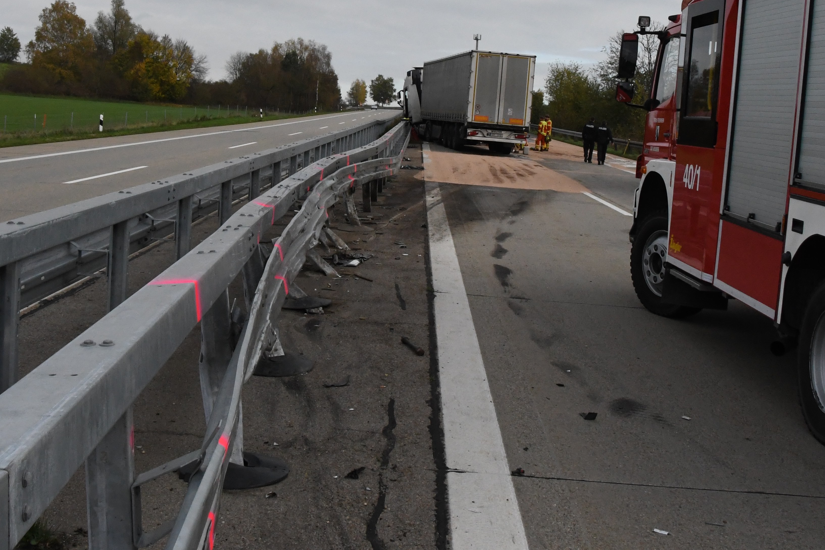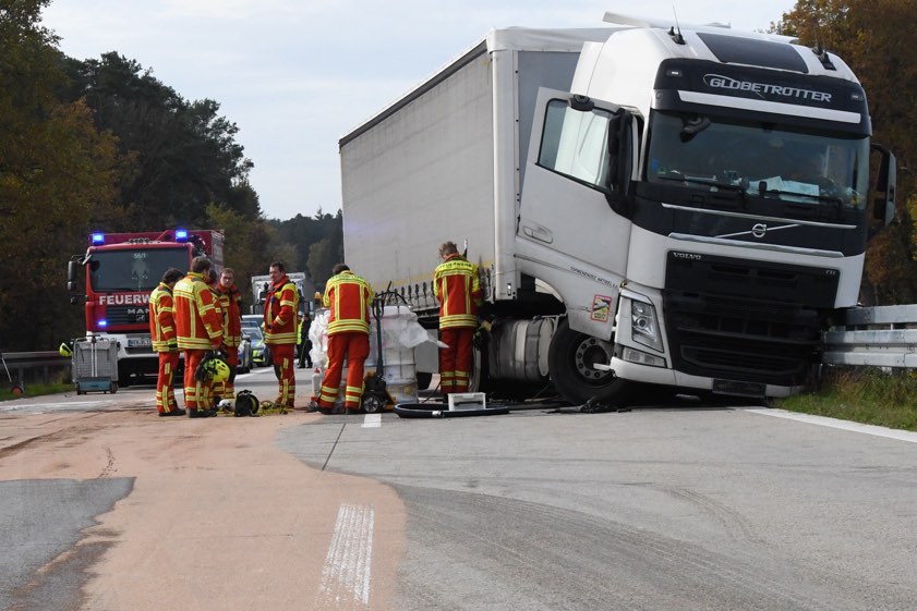 Kurz vor Hausen platzte an einem Sattelzug ein Reifen und das Gespann krachte in die Leitplanke. Rund 500 Liter Diesel ausgelaufen.