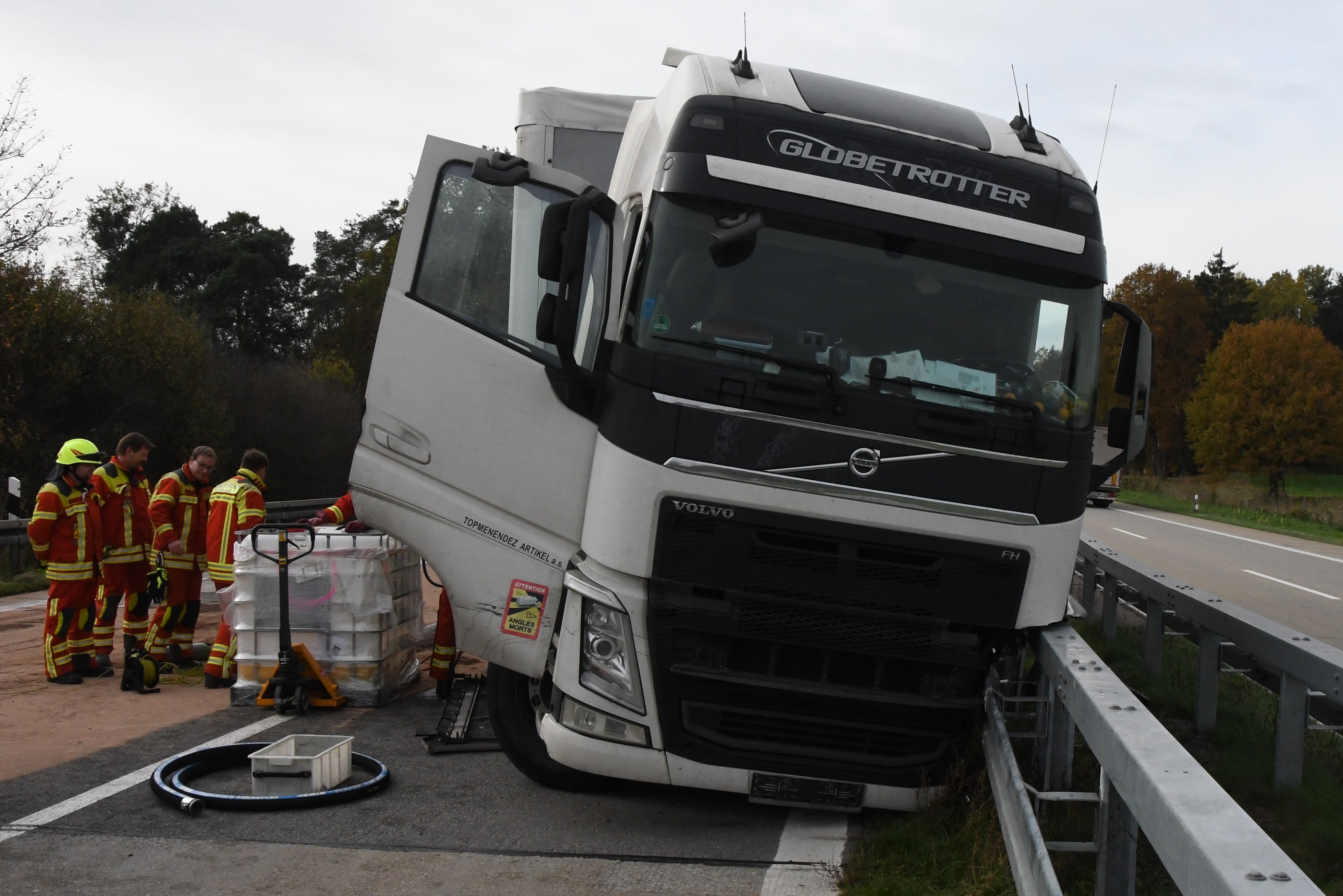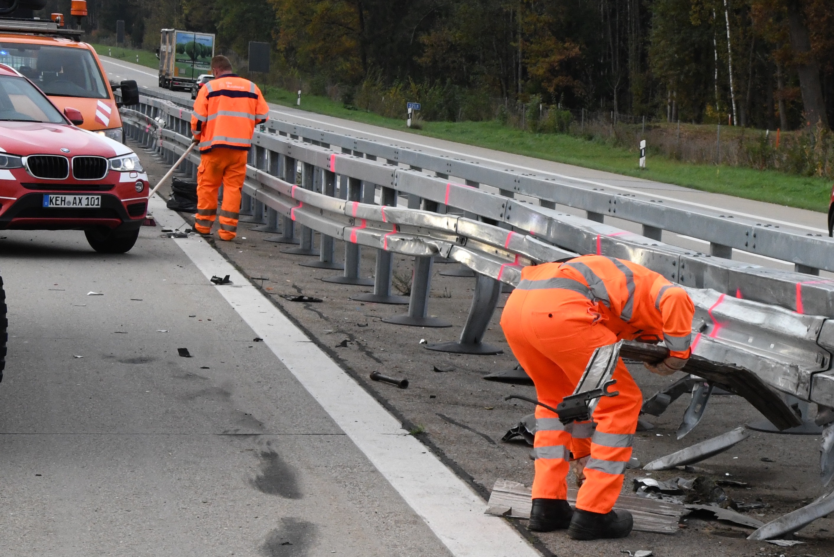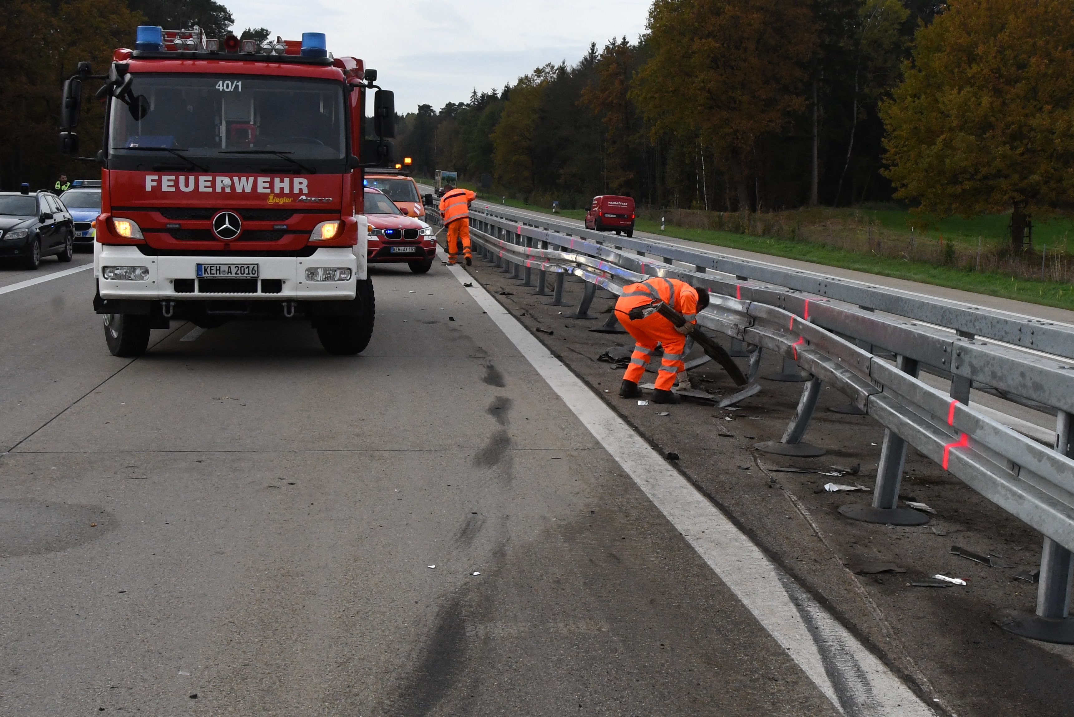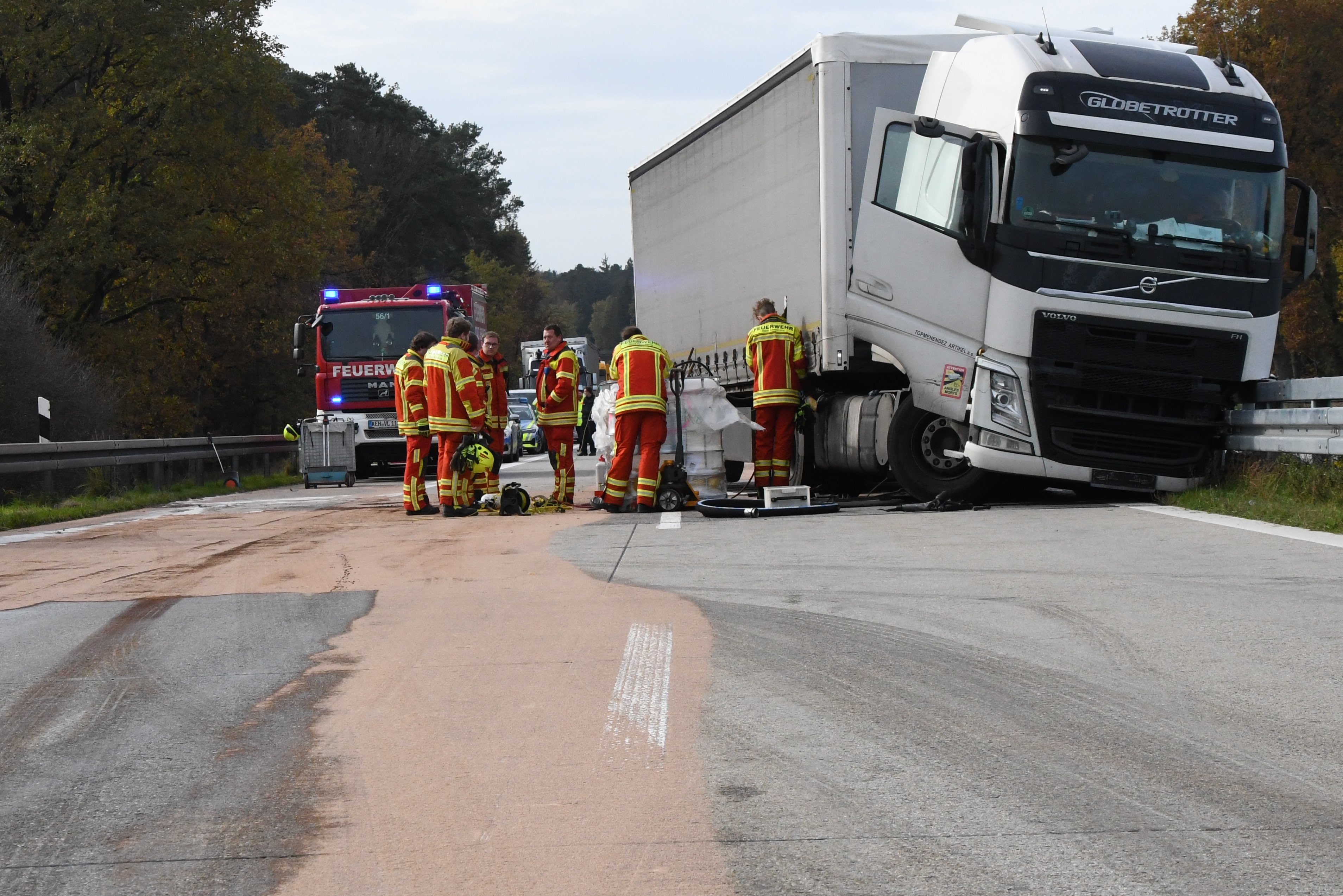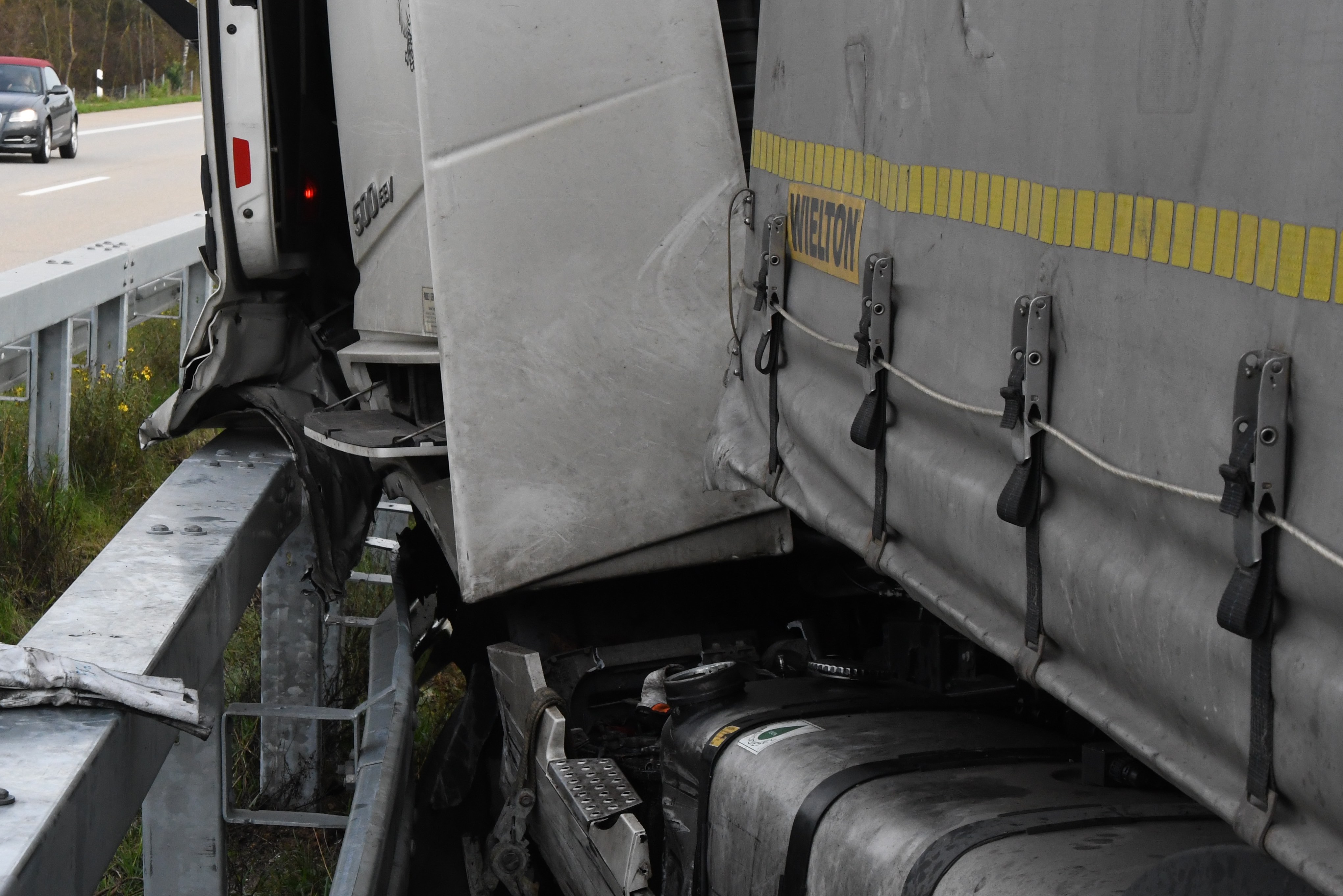Kurz vor Hausen platzte an einem Sattelzug ein Reifen und das Gespann krachte in die Leitplanke. Rund 500 Liter Diesel ausgelaufen.