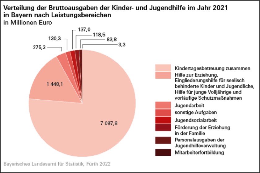 Von den Brutto-Ausgaben waren Aufwendungen für Kinder-Tages-Betreuung mit 7,098 Milliarden Euro der größte Posten. Die Ausgaben hierfür lagen 6,8 Prozent über denen des Vorjahres (6,643 Milliarden Euro). Zweitgrößter Posten waren Ausgaben für Hilfe zur Erziehung, Eingliederungshilfe für seelisch behinderte Kinder und Jugendliche, Hilfe für junge Volljährige und vorläufige Schutzmaßnahmen. Diese lagen mit 1,448 Milliarden Euro ebenfalls über dem Vorjahres-Niveau (1,404 Milliarden Euro).
