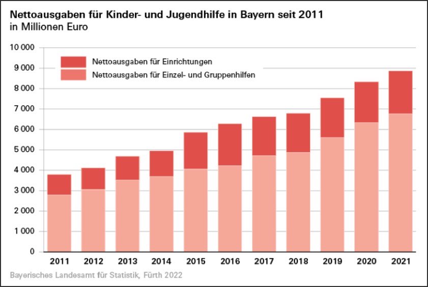 (ty) Im Laufe des vergangenen Jahres sind im Freistaat für Leistungen und Aufgaben der Kinder- und Jugendhilfe insgesamt Ausgaben in Höhe von 9,294 Milliarden Euro angefallen. Gegenüber dem Vorjahr (8,755 Milliarden Euro) entspricht das einer Steigung von 6,2 Prozent. Das wurde jetzt aus dem bayerischen Landesamt für Statistik gemeldet. Die Netto-Ausgaben lagen im vergangenen Jahr nach Abzug der Einnahmen bei 8,867 Milliarden Euro und damit 6,4 Prozent über dem Vorjahres-Niveau von 8,336 Milliarden Euro.