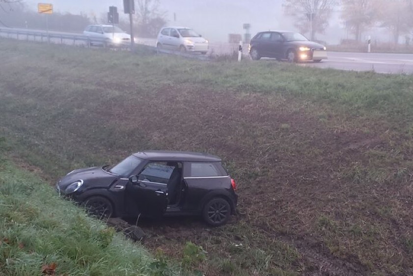 Als sie in den Kreisverkehr von B13 und Anton-Schranz-Straße steuerte, verlor sie die Kontrolle über ihren Mini und landete im Graben.