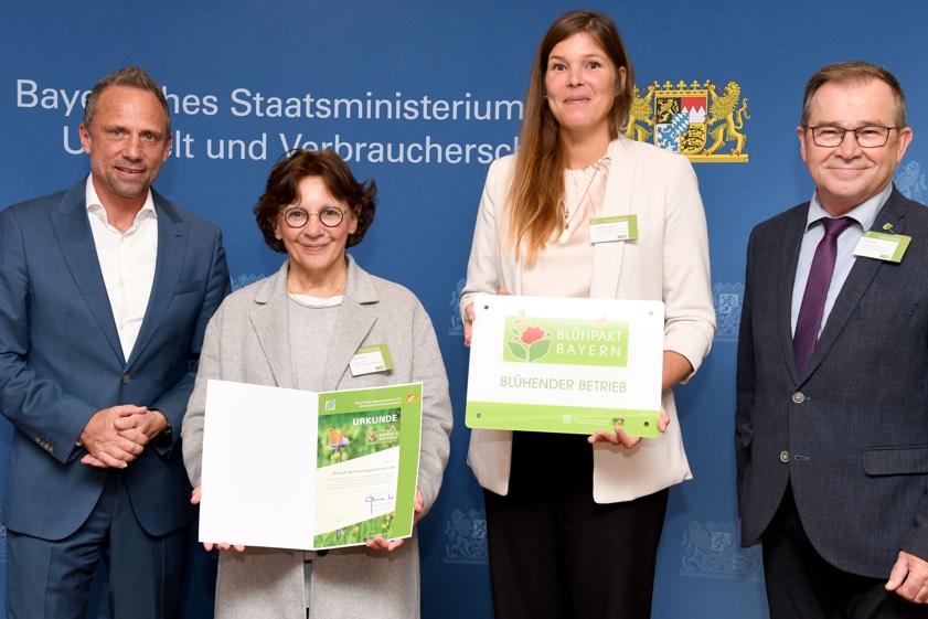 (ty) Acht bayerische Institutionen aus vier Regierungsbezirken haben kürzlich die staatliche Auszeichnung "Blühender Betrieb" erhalten. Auch die "WipflerPlan Planungs-Gesellschaft mbH" aus Pfaffenhofen konnte sich über dieses Prädikat freuen (Foto oben). Der bayerische Umwelt-Minister Thorsten Glauber betonte bei der Übergabe der Urkunden in München, mit der Auszeichnung honoriere man ein besonderes Engagement für die Artenvielfalt. Jeder Beitrag für mehr Artenschutz zähle. "Insekten brauchen mehr als Blühflächen. Gerade für den kommenden Winter ist das Belassen von Überwinterungs-Strukturen besonders wichtig." Artenvielfalt brauche keinen großen Aufwand, so der Minister: "Wenn wir in unseren Gärten mehr Unordnung zulassen und unsere Herzen dafür öffnen, werden wir mit mehr Artenvielfalt belohnt."