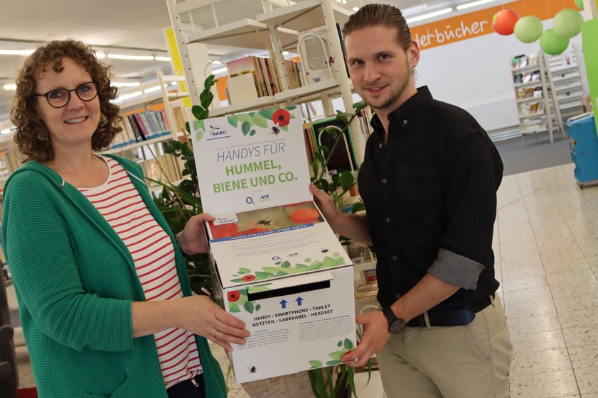 Zudem erhalte der Naturschutz-Bund jährlich eine feste Summe, die in den Insektenschutz-Fonds fließe. Damit würden Ackerflächen und Wiesen als Lebensraum für Hummeln, Bienen und andere Insekten gesichert. Der Schrobenhausener Klimaschutz-Beauftragte betont, dass nicht nur alle Arten von Mobiltelefonen und Smartphones angenommen werden, sondern auch Tablets, "gerne auch mit dem entsprechenden Zubehör wie Netzteil, Ladekabel oder Headset". Kern kann sich gut vorstellen, dass eine solche Sammel-Box auch noch an weiteren Anlaufstellen in Schrobenhausen aufgestellt wird. Auf dem Foto präsentieren Kern und Stadtücherei-Mitarbeiterin Heike Kielsmeier die Box. (Foto: Stadt Schrobenhausen)
