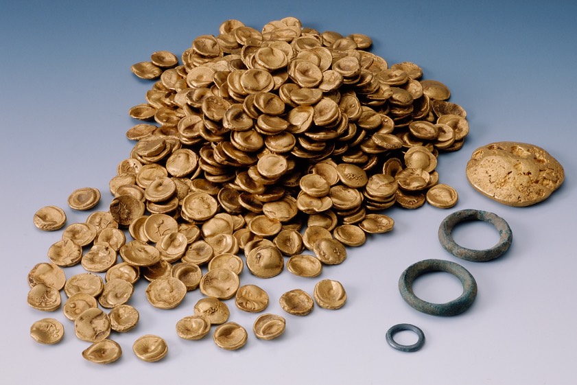 Der keltische Gold-Schatz von Manching mit drei ebenfalls entdeckten Bronze-Ringen.