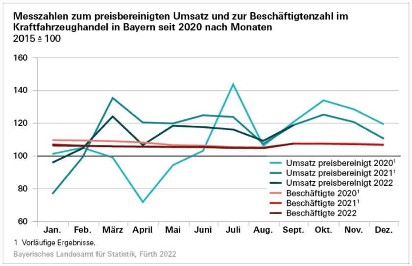 Die Zahl der Beschäftigten nahm im ersten Dreivierteljahr im "Handel mit Krafträdern, Kraftradteilen und -zubehör; Instandhaltung und Reparatur von Krafträdern" um 0,8 Prozent zu. Weniger Beschäftigte als im gleichen Zeitraum des vergangenen Jahres waren von Januar bis September heuer in der "Instandhaltung und Reparatur von Kraftwagen" tätig. Im Vergleich konstant geblieben ist die Beschäftigten-Zahl in den übrigen beiden Wirtschafts-Gruppen des bayerischen Kfz-Handels.