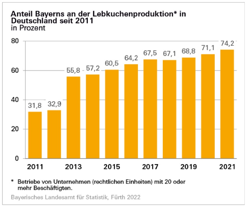Im bundesweiten Vergleich kamen nach Angaben des Landesamts im vergangenen Jahr mit einem Anteil von 74,2 Prozent knapp drei Viertel aller Lebkuchen aus Bayern. Damit knackte der Freistaat ebenfalls eine neue Höchstmarke der vergangenen zehn Jahre. Im Jahr 2011 waren etwa drei von zehn Lebkuchen (31,8 Prozent) im Freistaat produziert worden. Diese Angaben beziehen sich auf Betriebe von Unternehmen (rechtlichen Einheiten) mit 20 oder mehr Beschäftigten. In Bayern waren dies 26 Betriebe im vergangenen Jahr.