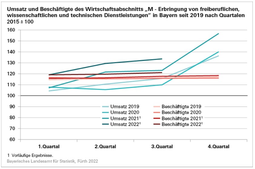 Gegenüber dem Vorquartal erhöhte sich der Umsatz im Wirtschafts-Abschnitt "Erbringung von sonstigen wirtschaftlichen Dienstleistungen" im dritten Quartal 2022 um knapp zehn Prozent, in den drei weiteren Wirtschafts-Abschnitten jeweils um gut drei Prozent. Die Beschäftigten-Zahl wuchs jeweils um rund ein Prozent.
