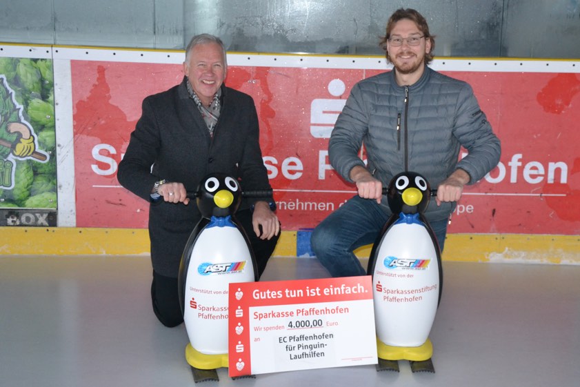 (ty) Mit einer stattlichen Spende an den Eissport-Club von Pfaffenhofen (ECP) hat die Stiftung der Sparkasse von Pfaffenhofen den Kauf von zehn neuen Pinguin-Laufhilfen ermöglicht. "Anfänger erlernen durch diese lustigen Lernhilfen ganz einfach und mit viel Spaß das Schlittschuhlaufen und finden so schnell Sicherheit auf dem Eis", erklärt das Geldinstitut zum Hintergrund dieses Engagements. Die "süßen Pingis" seien jedenfalls von den eislaufenden Buben und Mädchen sofort ins Herz geschlossen worden. Den symbolischen Spenden-Scheck über eine Summe von 4000 Euro übergab der zuständige Markt-Direktor der Sparkasse, Michael Hoyer, an den ECP-Vorsitzenden Jan Hofbauer (Foto oben).