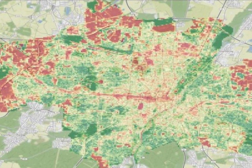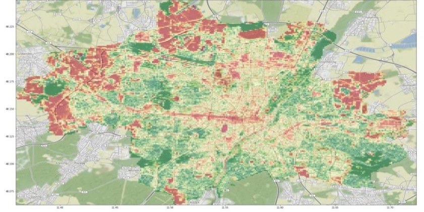 Die Mitarbeiter aus dem "InnovationLab" hatten nach Angaben der Stadtverwaltung das Ausgangs-Modell trainiert und durch eigene Modelle für das Stadtgebiet von München erweitert. Gezählt worden seien auf diese Weise letztlich 1 693 614 Bäume – und zwar auf der Grundlage der auf den Luftbildern identifizierten Baumkronen. Eine so genannte Heatmap stellt jetzt Gebiete mit besonders hohem Baumbestand grün und solche mit niedrigem Baumbestand rot dar (siehe Fotos).
