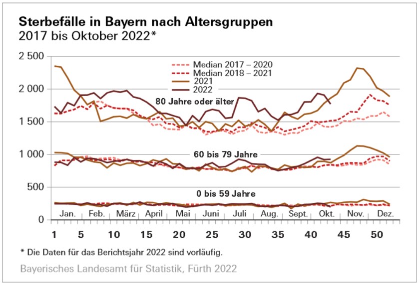 (ty) Wie das Expertenteam des bayerischen Landesamts für Statistik nach der Auswertung von vorläufigen Daten jetzt mitgeteilt hat, lag die Zahl der gestorbenen Menschen im Freistaat im Oktober dieses Jahres mit insgesamt 13 318 Personen über dem Niveau des Medians der Jahre 2018 bis 2021 (11 309 gestorbene Menschen). Das Plus beträgt fast 18 Prozent. Nach Angaben der Behörde verzeichnete die Gruppe der 60- bis 79-Jährigen im Vergleich zu den Vorjahren einen Anstieg um 13,3 Prozent. Bei den 80-Jährigen und Älteren lagen die Sterbefall-Zahlen im Oktober um 22,0 Prozent über dem Median der Jahre 2018 bis 2021.