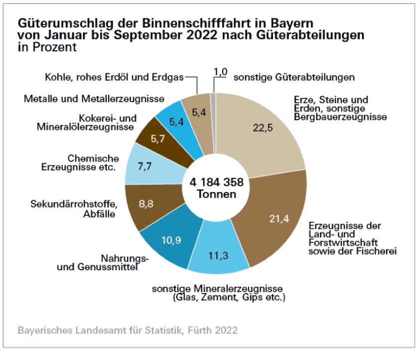 Auf den bayerischen Bundeswasserstraßen wurden in den ersten drei Quartalen des Jahres 2022 hauptsächlich "Erze, Steine und Erden" (22,5 Prozent) sowie "Erzeugnisse der Land- und Forstwirtschaft" (21,4 Prozent) transportiert. Weitere 11,3 Prozent entfielen auf die Abteilung "Sonstige Mineralerzeugnisse (Glas, Zement, Gips etc.)".